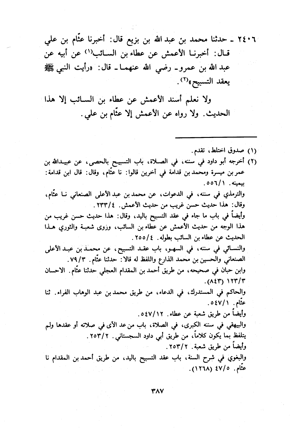 2406 - حَدَّثَنَا مُحَمَّدُ بْنُ عَبْدِ اللَّهِ بْنِ بَزِيعٍ، قَالَ: أَخْبَرَنَا عَثَّامُ بْنُ عَلِيٍّ، قَالَ: أَخْبَرَنَا الْأَعْمَشُ، عَنْ عَطَاءِ بْنِ السَّائِبِ، عَنْ أَبِيهِ، عَنْ عَبْدِ اللَّهِ بْنِ عَمْرٍو رَضِيَ اللَّهُ عَنْهُمَا، قَالَ: «رَأَيْتُ النَّبِيَّ §يَعْقِدُ التَّسْبِيحَ» . وَلَا نَعْلَمُ أَسْنَدَ الْأَعْمَشُ، عَنْ عَطَاءِ بْنِ السَّائِبِ إِلَّا هَذَا الْحَدِيثَ، وَلَا رَوَاهُ عَنِ الْأَعْمَشِ، إِلَّا عَثَّامُ بْنُ عَلِيٍّ