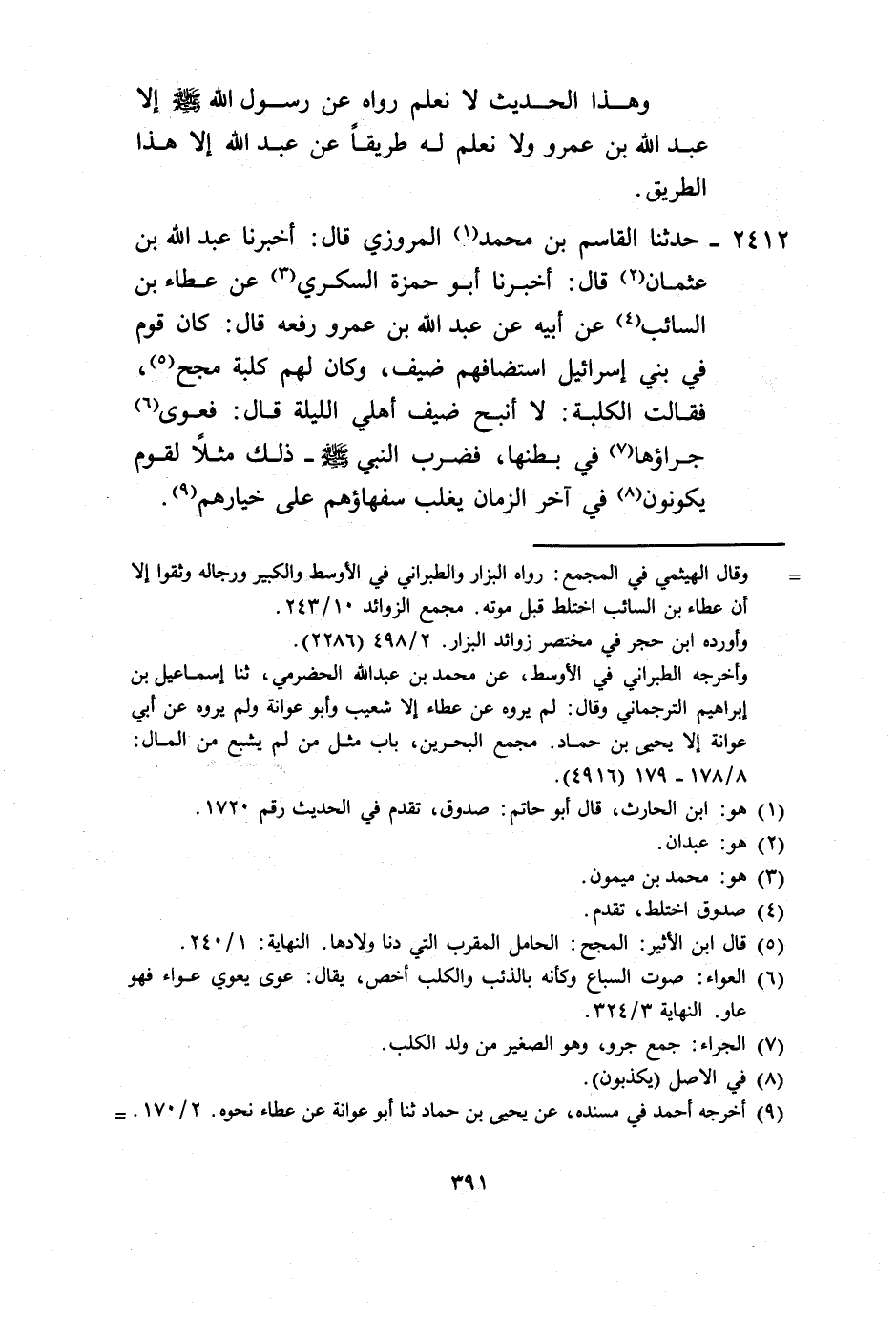 2412 - حَدَّثَنَا الْقَاسِمُ بْنُ مُحَمَّدٍ الْمَرْوَزِيُّ، قَالَ: أَخْبَرَنَا عَبْدُ اللَّهِ بْنُ عُثْمَانَ، قَالَ: أَخْبَرَنَا أَبُو حَمْزَةَ السُّكَّرِيُّ، عَنْ عَطَاءِ بْنِ السَّائِبِ، عَنْ أَبِيهِ، عَنْ عَبْدِ اللَّهِ بْنِ عَمْرٍو رَفَعَهُ، قَالَ: " كَانَ قَوْمٌ فِي بَنِي إِسْرَائِيلَ اسْتَضَافَهُمْ ضَيْفٌ، وَكَانَ لَهُمْ كَلْبَةٌ مُجِحٌّ فَقَالَتِ الْكَلْبَةُ: لَا أَنْبَحُ ضَيْفَ أَهْلِي اللَّيْلَةَ، قَالَ: فَعَوَى جِرَاؤُهَا فِي بَطْنِهَا §فَضَرَبَ النَّبِيُّ صَلَّى اللهُ عَلَيْهِ وَسَلَّمَ ذَلِكَ لِقَوْمٍ يَكُونُونَ فِي آخِرِ الزَّمَانِ يَغْلِبَ سُفَهَاؤُهُمْ عَلَى خِيَارِهِمْ "