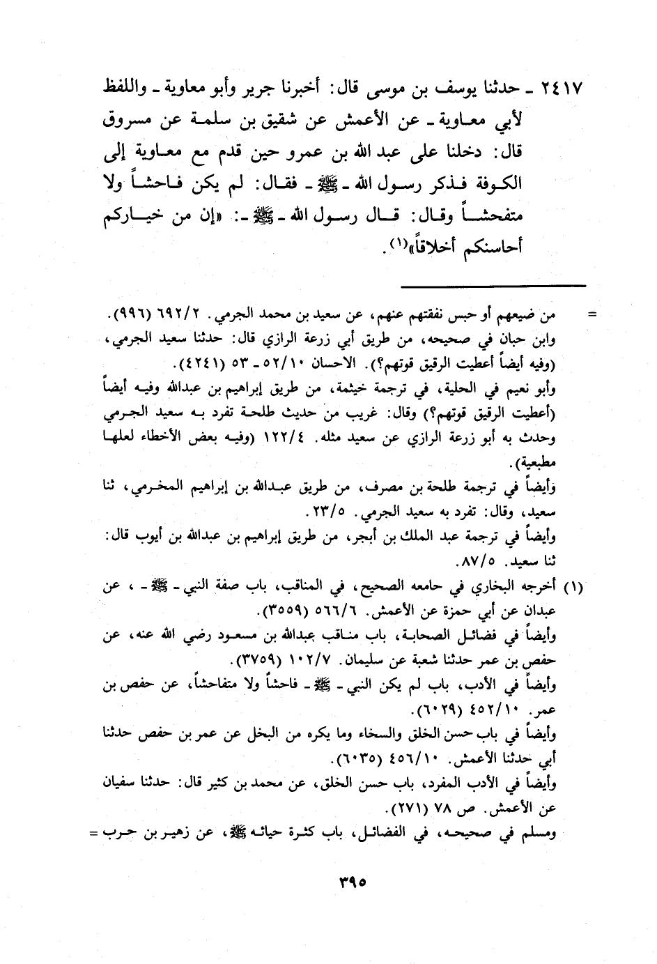 2417 - حَدَّثَنَا يُوسُفُ بْنُ مُوسَى، قَالَ: أَخْبَرَنَا جَرِيرٌ، وَأَبُو مُعَاوِيَةَ، وَاللَّفْظُ لِأَبِي مُعَاوِيَةَ، عَنِ الْأَعْمَشِ، عَنْ شَقِيقِ بْنِ سَلَمَةَ، عَنْ مَسْرُوقٍ، قَالَ: دَخَلْنَا عَلَى عَبْدِ اللَّهِ بْنِ عَمْرٍو حِينَ قَدِمَ مَعَ مُعَاوِيَةَ إِلَى الْكُوفَةِ، فَذَكَرَ رَسُولَ اللَّهِ صَلَّى اللهُ عَلَيْهِ وَسَلَّمَ فَقَالَ: لَمْ يَكُنْ فَاحِشًا وَلَا مُتَفَحِّشًا، وَقَالَ: قَالَ رَسُولُ اللَّهِ صَلَّى اللهُ عَلَيْهِ وَسَلَّمَ: «إِنَّ §مِنْ خِيَارِكُمْ أَحَاسِنُكُمْ أَخْلَاقًا»