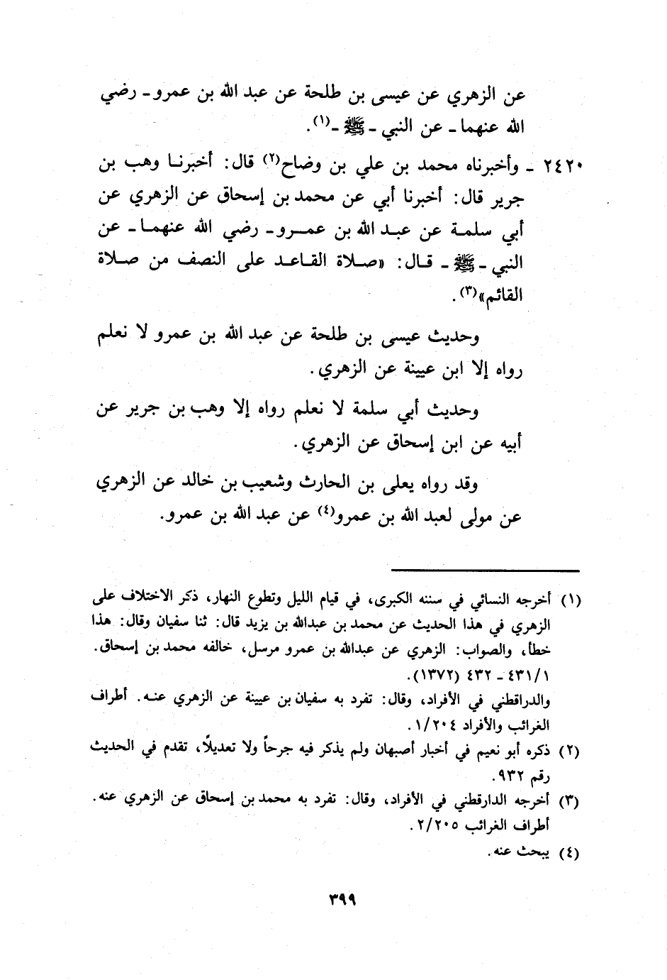 2420 - وَأَخْبَرَنَاهُ مُحَمَّدُ بْنُ عَلِيِّ بْنِ وَضَّاحٍ، قَالَ: أَخْبَرَنَا وَهْبُ بْنُ جَرِيرٍ، قَالَ: أَخْبَرَنَا أَبِي، عَنْ مُحَمَّدِ بْنِ إِسْحَاقَ، عَنِ الزُّهْرِيِّ، عَنْ أَبِي سَلَمَةَ، عَنْ عَبْدِ اللَّهِ بْنِ عَمْرٍو رَضِيَ اللَّهُ عَنْهُمَا، عَنِ النَّبِيِّ صَلَّى اللهُ عَلَيْهِ وَسَلَّمَ قَالَ: «§صَلَاةُ الْقَاعِدِ عَلَى النِّصْفِ مِنْ صَلَاةِ الْقَائِمِ» . وَحَدِيثُ عِيسَى بْنِ طَلْحَةَ، عَنْ عَبْدِ اللَّهِ بْنِ عَمْرٍو. لَا نَعْلَمُ رَوَاهُ إِلَّا ابْنُ عُيَيْنَةَ، عَنِ الزُّهْرِيِّ. وَحَدِيثُ أَبِي سَلَمَةَ لَا نَعْلَمُ رَوَاهُ إِلَّا وَهْبُ بْنُ جَرِيرٍ، عَنْ أَبِيهِ، عَنِ ابْنِ إِسْحَاقَ، عَنِ الزُّهْرِيِّ. وَقَدْ رَوَاهُ يَعْلَى بْنُ الْحَارِثِ، وَشُعَيْبُ بْنُ خَالِدٍ، عَنِ الزُّهْرِيِّ، عَنْ مَوْلًى لِعَبْدِ اللَّهِ بْنِ عَمْرٍو، عَنْ عَبْدِ اللَّهِ بْنِ عَمْرٍو -[400]-.