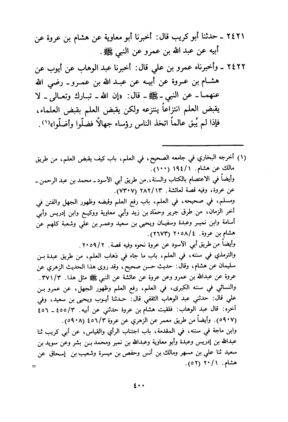 2422 - وَأَخْبَرَنَاهُ عَمْرُو بْنُ عَلِيٍّ، قَالَ: أَخْبَرَنَا عَبْدُ الْوَهَّابِ، عَنْ أَيُّوبَ، عَنْ هِشَامِ بْنِ عُرْوَةَ، عَنْ أَبِيهِ، عَنْ عَبْدِ اللَّهِ بْنِ عَمْرٍو رَضِيَ اللَّهُ عَنْهُمَا، عَنِ النَّبِيِّ صَلَّى اللهُ عَلَيْهِ وَسَلَّمَ قَالَ: «إِنَّ §اللَّهَ تَبَارَكَ وَتَعَالَى لَا يَقْبِضُ الْعِلْمَ انْتِزَاعًا يَنْتَزِعُهُ وَلَكِنْ يَقْبِضُ الْعِلْمَ بِقَبْضِ الْعُلَمَاءِ فَإِذَا لَمْ يُبْقِ عَالِمًا اتَّخَذَ النَّاسُ رُؤَسَاءَ جُهَّالًا فَضَلُّوا وَأَضَلُّوا»