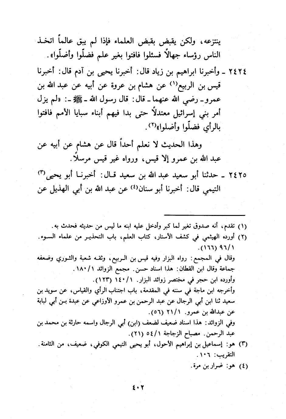 2424 - وَأَخْبَرَنَا إِبْرَاهِيمُ بْنُ زِيَادٍ، قَالَ: أَخْبَرَنَا يَحْيَى بْنُ آدَمَ، قَالَ: أَخْبَرَنَا قَيْسُ بْنُ الرَّبِيعِ، عَنْ هِشَامِ بْنِ عُرْوَةَ، عَنْ أَبِيهِ، عَنْ عَبْدِ اللَّهِ بْنِ عَمْرٍو رَضِيَ اللَّهُ عَنْهُمَا، قَالَ: قَالَ رَسُولُ اللَّهِ صَلَّى اللهُ عَلَيْهِ وَسَلَّمَ: «§لَمْ يَزَلْ أَمْرُ بَنِي إِسْرَائِيلَ مُعْتَدِلًا حَتَّى بَدَا فِيهِمْ أَبْنَاءُ سَبَايَا الْأُمَمِ، فَأَفْتَوْا بِالرَّأْيِ فَضَلُّوا وَأَضَلُّوا» . وَهَذَا الْحَدِيثُ لَا نَعْلَمُ أَحَدًا قَالَ: عَنْ هِشَامٍ، عَنْ أَبِيهِ، عَنْ عَبْدِ اللَّهِ بْنِ عَمْرٍو، إِلَّا قَيْسٌ، وَرَوَاهُ غَيْرُ قَيْسٍ مُرْسَلًا