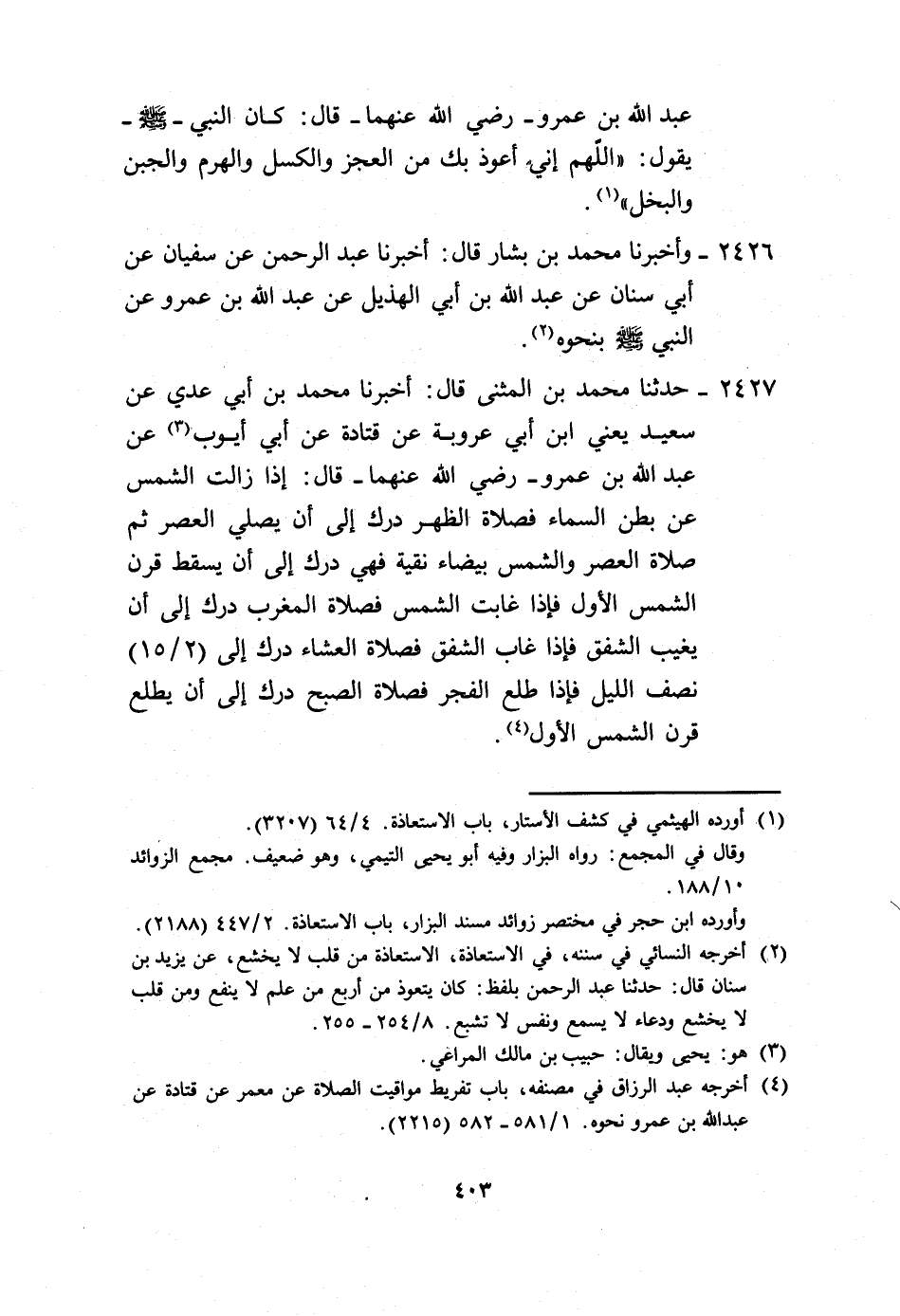 2427 - حَدَّثَنَا مُحَمَّدُ بْنُ الْمُثَنَّى، قَالَ: أَخْبَرَنَا مُحَمَّدُ بْنُ أَبِي عَدِيٍّ، عَنْ سَعِيدٍ يَعْنِي ابْنَ أَبِي عَرُوبَةَ، عَنْ قَتَادَةَ، عَنْ أَبِي أَيُّوبَ، عَنْ عَبْدِ اللَّهِ بْنِ عَمْرٍو رَضِيَ اللَّهُ عَنْهُمَا، قَالَ: «§إِذَا زَالَتِ الشَّمْسُ عَنْ بَطْنِ السَّمَاءِ فَصَلَاةُ الظُّهْرِ دَرَكٌ إِلَى أَنْ يُصَلِّيَ الْعَصْرَ، ثُمَّ صَلَاةُ الْعَصْرِ وَالشَّمْسُ بَيْضَاءُ نَقِيَّةٌ فَهِيَ دَرَكٌ إِلَى أَنْ يَسْقُطَ قَرْنُ الشَّمْسِ الْأَوَّلُ، فَإِذَا غَابَتِ الشَّمْسُ فَصَلَاةُ الْمَغْرِبِ دَرَكٌ إِلَى أَنْ يَغِيبَ الشَّفَقُ، فَإِذَا غَابَ الشَّفَقُ فَصَلَاةُ الْعِشَاءِ دَرَكٌ إِلَى نِصْفِ اللَّيْلِ، فَإِذَا طَلَعَ الْفَجْرُ فَصَلَاةُ الصُّبْحِ دَرَكٌ إِلَى أَنْ يَطْلُعَ قَرْنُ الشَّمْسِ الْأَوَّلُ»