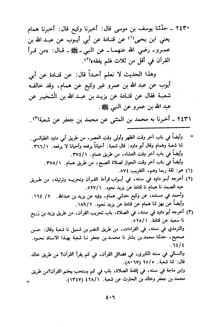 2430 - حَدَّثَنَا يُوسُفُ بْنُ مُوسَى، قَالَ: أَخْبَرَنَا وَكِيعٌ، قَالَ: أَخْبَرَنَا هَمَّامٌ يَعْنِي ابْنَ يَحْيَى، عَنْ قَتَادَةَ، عَنْ أَبِي أَيُّوبَ، عَنْ عَبْدِ اللَّهِ بْنِ عَمْرٍو رَضِيَ اللَّهُ عَنْهُمَا، عَنِ النَّبِيِّ صَلَّى اللهُ عَلَيْهِ وَسَلَّمَ، قَالَ: «§مَنْ قَرَأَ الْقُرْآنَ فِي أَقَلِّ مِنْ ثَلَاثٍ فَلَمْ يَفْقَهْ» . وَهَذَا الْحَدِيثُ لَا نَعْلَمُ أَحَدًا، قَالَ: عَنْ قَتَادَةَ، عَنْ أَبِي أَيُّوبَ، عَنْ عَبْدِ اللَّهِ بْنِ عَمْرٍو غَيْرُ وَكِيعٍ، عَنْ هَمَّامٍ، وَقَدْ خَالَفَهُ شُعْبَةُ فَقَالَ، عَنْ قَتَادَةَ، عَنْ يَزِيدَ بْنِ عَبْدِ اللَّهِ بْنِ الشِّخِّيرِ، عَنْ عَبْدِ اللَّهِ بْنِ عَمْرٍو، عَنِ النَّبِيِّ صَلَّى اللهُ عَلَيْهِ وَسَلَّمَ.