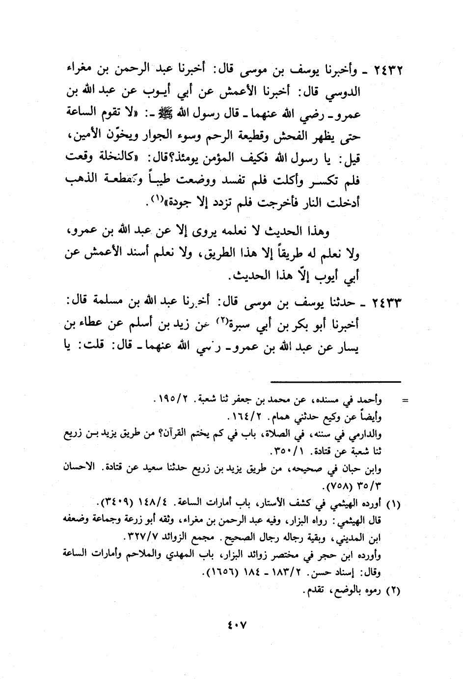 2432 - وَأَخْبَرَنَا يُوسُفُ بْنُ مُوسَى، قَالَ: أَخْبَرَنَا عَبْدُ الرَّحْمَنِ بْنُ مَغْرَاءَ الدَّوْسِيُّ، قَالَ: أَخْبَرَنَا الْأَعْمَشُ، عَنْ أَبِي أَيُّوبَ، عَنْ عَبْدِ اللَّهِ بْنِ عَمْرٍو رَضِيَ اللَّهُ عَنْهُمَا، قَالَ رَسُولُ اللَّهِ صَلَّى اللهُ عَلَيْهِ وَسَلَّمَ: «§لَا تَقُومُ السَّاعَةُ حَتَّى يَظْهَرَ الْفُحْشُ، وَقَطِيعَةُ الرَّحِمِ، وَسُوءُ الْجِوَارِ، وَيُخَوَّنَ الْأَمِينُ» قِيلَ: يَا رَسُولَ اللَّهِ، فَكَيْفَ الْمُؤْمِنُ يَوْمَئِذٍ؟ قَالَ: «كَالنَّخْلَةِ وَقَعَتْ فَلَمْ تُكْسَرْ، وَأُكِلَتْ فَلَمْ تَفْسُدْ، وَوَضَعَتْ طِيبًا، وَكَقِطْعَةِ الذَّهَبِ أُدْخِلَتِ النَّارَ فَأُخْرِجَتْ فَلَمْ تَزْدَدْ إِلَّا جَوْدَةً» . وَهَذَا الْحَدِيثُ لَا نَعْلَمُهُ يُرْوَى إِلَّا عَنْ عَبْدِ اللَّهِ بْنِ عَمْرٍو، وَلَا نَعْلَمُ لَهُ طَرِيقًا إِلَّا هَذَا الطَّرِيقَ، وَلَا نَعْلَمُ أَسْنَدَ الْأَعْمَشُ، عَنْ أَبِي أَيُّوبَ إِلَّا هَذَا الْحَدِيثَ
