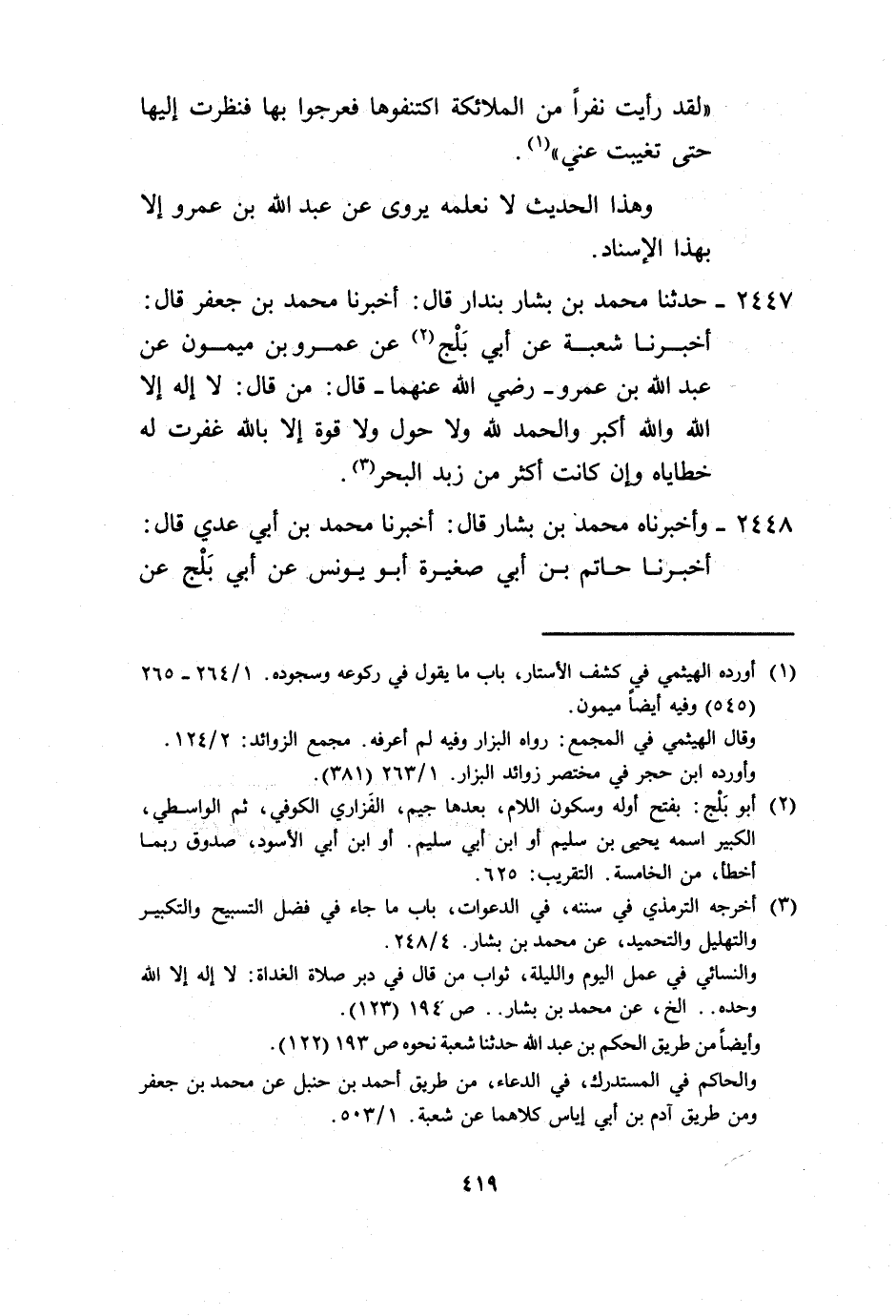2447 - حَدَّثَنَا مُحَمَّدُ بْنُ بَشَّارٍ بُنْدَارٌ، قَالَ: أَخْبَرَنَا مُحَمَّدُ بْنُ جَعْفَرٍ، قَالَ: أَخْبَرَنَا شُعْبَةُ عَنْ أَبِي بَلْجٍ، عَنْ عَمْرِو بْنِ مَيْمُونٍ، عَنْ عَبْدِ اللَّهِ بْنِ عَمْرٍو رَضِيَ اللَّهُ عَنْهُمَا، قَالَ: §مَنْ قَالَ لَا إِلَهَ إِلَّا اللَّهُ وَاللَّهُ أَكْبَرُ وَالْحَمْدُ لِلَّهِ وَلَا حَوْلَ وَلَا قُوَّةَ إِلَّا بِاللَّهِ غُفِرَتْ لَهُ خَطَايَاهُ وَإِنْ كَانَتْ أَكْثَرَ مِنْ زَبَدِ الْبَحْرِ ".
