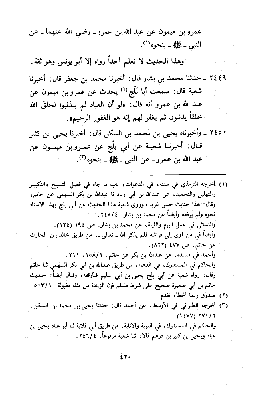 2449 - حَدَّثَنَا مُحَمَّدُ بْنُ بَشَّارٍ، قَالَ: أَخْبَرَنَا مُحَمَّدُ بْنُ جَعْفَرٍ، قَالَ: أَخْبَرَنَا شُعْبَةُ، قَالَ: سَمِعْتُ أَبَا بَلْجٍ، يُحَدِّثُ عَنْ عَمْرِو بْنِ مَيْمُونٍ، عَنْ عَبْدِ اللَّهِ بْنِ عَمْرٍو، أَنَّهُ قَالَ: «§لَوْ أَنَّ الْعِبَادَ لَمْ يُذْنِبُوا لَخَلَقَ اللَّهُ خَلْقًا يُذْنِبُونَ ثُمَّ يَغْفِرُ لَهُمْ إِنَّهُ هُوَ الْغَفُورُ الرَّحِيمُ» .