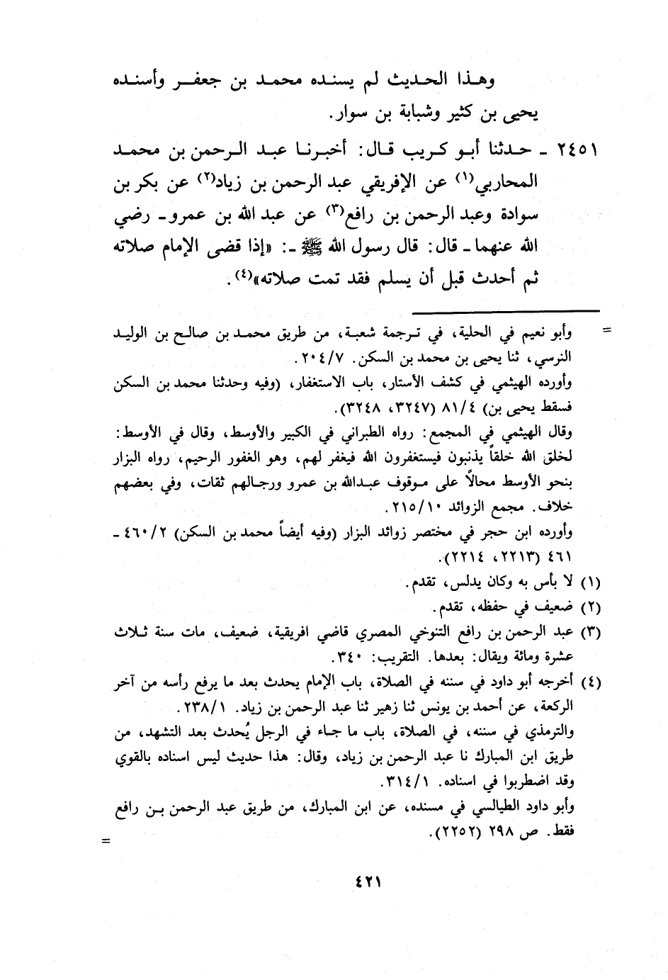 2451 - حَدَّثَنَا أَبُو كُرَيْبٍ، قَالَ: أَخْبَرَنَا عَبْدُ الرَّحْمَنِ بْنُ مُحَمَّدٍ الْمُحَارِبِيُّ، عَنِ الْإِفْرِيقِيِّ عَبْدِ الرَّحْمَنِ بْنِ زِيَادٍ، عَنْ بَكْرِ بْنِ سَوَادَةَ، وَعَبْدِ الرَّحْمَنِ بْنِ رَافِعٍ، عَنْ عَبْدِ اللَّهِ بْنِ عَمْرٍو رَضِيَ اللَّهُ عَنْهُمَا، قَالَ: قَالَ رَسُولُ اللَّهِ صَلَّى اللهُ عَلَيْهِ وَسَلَّمَ: «§إِذَا قَضَى الْإِمَامُ صَلَاتَهُ ثُمَّ أَحْدَثَ قَبْلَ أَنْ يُسَلِّمَ فَقَدْ تَمَّتْ صَلَاتُهُ» -[422]-. وَهَذَا الْحَدِيثُ لَا نَعْلَمُ رَوَاهُ عَنِ النَّبِيِّ صَلَّى اللهُ عَلَيْهِ وَسَلَّمَ، إِلَّا عَبْدُ اللَّهِ بْنُ عَمْرٍو، وَعَبْدُ الرَّحْمَنِ بْنُ رَافِعٍ لَا نَعْلَمُ رَوَى عَنْهُ إِلَّا الْإِفْرِيقِيُّ، وَلَمْ يَكُنْ بِحَافِظٍ لِلْحَدِيثِ، وَلَا نَعْلَمُ لَهُ طَرِيقًا إِلَّا هَذَا الطَّرِيقَ