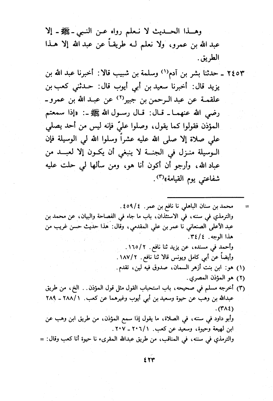 2453 - حَدَّثَنَا بِشْرُ بْنُ آدَمَ، وَسَلَمَةُ بْنُ شَبِيبٍ، قَالَا: أَخْبَرَنَا عَبْدُ اللَّهِ بْنُ يَزِيدَ، قَالَ: أَخْبَرَنَا سَعِيدُ بْنُ أَبِي أَيُّوبَ، قَالَ: حَدَّثَنِي كَعْبُ بْنُ عَلْقَمَةَ، عَنْ عَبْدِ الرَّحْمَنِ بْنِ جُبَيْرٍ، عَنْ عَبْدِ اللَّهِ بْنِ عَمْرٍو رَضِيَ اللَّهُ عَنْهُمَا قَالَ: قَالَ رَسُولُ اللَّهِ صَلَّى اللهُ عَلَيْهِ وَسَلَّمَ: «§إِذَا سَمِعْتُمُ الْمُؤَذِّنَ فَقُولُوا كَمَا يَقُولُ، وَصَلُّوا عَلَيَّ فَإِنَّهُ لَيْسَ مِنْ أَحَدٍ يُصَلِّي عَلَيَّ صَلَاةً إِلَّا صَلَّى اللَّهُ عَلَيْهِ عَشْرًا، وَسَلُوا اللَّهَ لِيَ الْوَسِيلَةَ فَإِنَّ الْوَسِيلَةَ مَنْزِلٌ فِي الْجَنَّةِ لَا يَنْبَغِي أَنْ يَكُونَ إِلَّا لِعَبْدٍ مِنْ عَبَّادِ اللَّهِ، وَأَرْجُو أَنْ أَكُونَ أَنَا هُوَ، وَمَنْ سَأَلَهَا لِي حَلَّتْ عَلَيْهِ شَفَاعَتِي يَوْمَ الْقِيَامَةِ» -[424]-. وَهَذَا الْحَدِيثُ قَدْ رُوِيَ نَحْوٌ مِنْ كَلَامِهِ عَنِ النَّبِيِّ صَلَّى اللهُ عَلَيْهِ وَسَلَّمَ مِنْ وُجُوهٍ، وَلَا نَعْلَمُهُ يُرْوَى بِهَذَا اللَّفْظِ إِلَّا عَنْ عَبْدِ اللَّهِ بْنِ عَمْرٍو بِهَذَا الْإِسْنَادِ