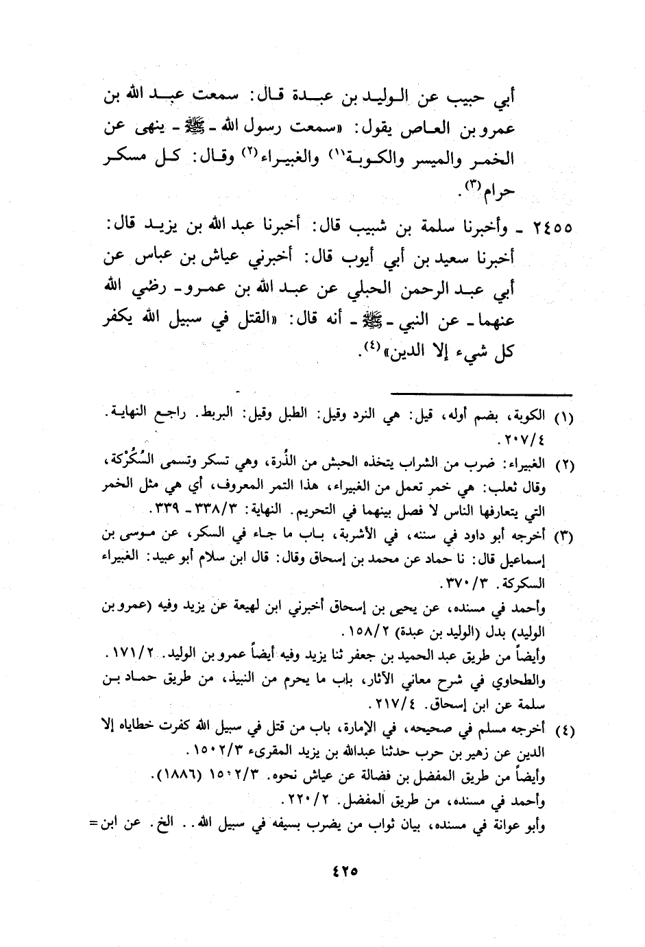 2455 - وَأَخْبَرَنَا سَلَمَةُ بْنُ شَبِيبٍ، قَالَ: أَخْبَرَنَا عَبْدُ اللَّهِ بْنُ يَزِيدَ، قَالَ: أَخْبَرَنَا سَعِيدُ بْنُ أَبِي أَيُّوبَ، قَالَ: أَخْبَرَنِي عَيَّاشُ بْنُ عَبَّاسٍ، عَنْ أَبِي عَبْدِ الرَّحْمَنِ الْحُبُلِيِّ، عَنْ عَبْدِ اللَّهِ بْنِ عَمْرٍو رَضِيَ اللَّهُ عَنْهُمَا، عَنِ النَّبِيِّ صَلَّى اللهُ عَلَيْهِ وَسَلَّمَ أَنَّهُ قَالَ: «§الْقَتْلُ فِي سَبِيلِ اللَّهِ يُكَفِّرُ كُلَّ شَيْءٍ إِلَّا الدَّيْنَ»