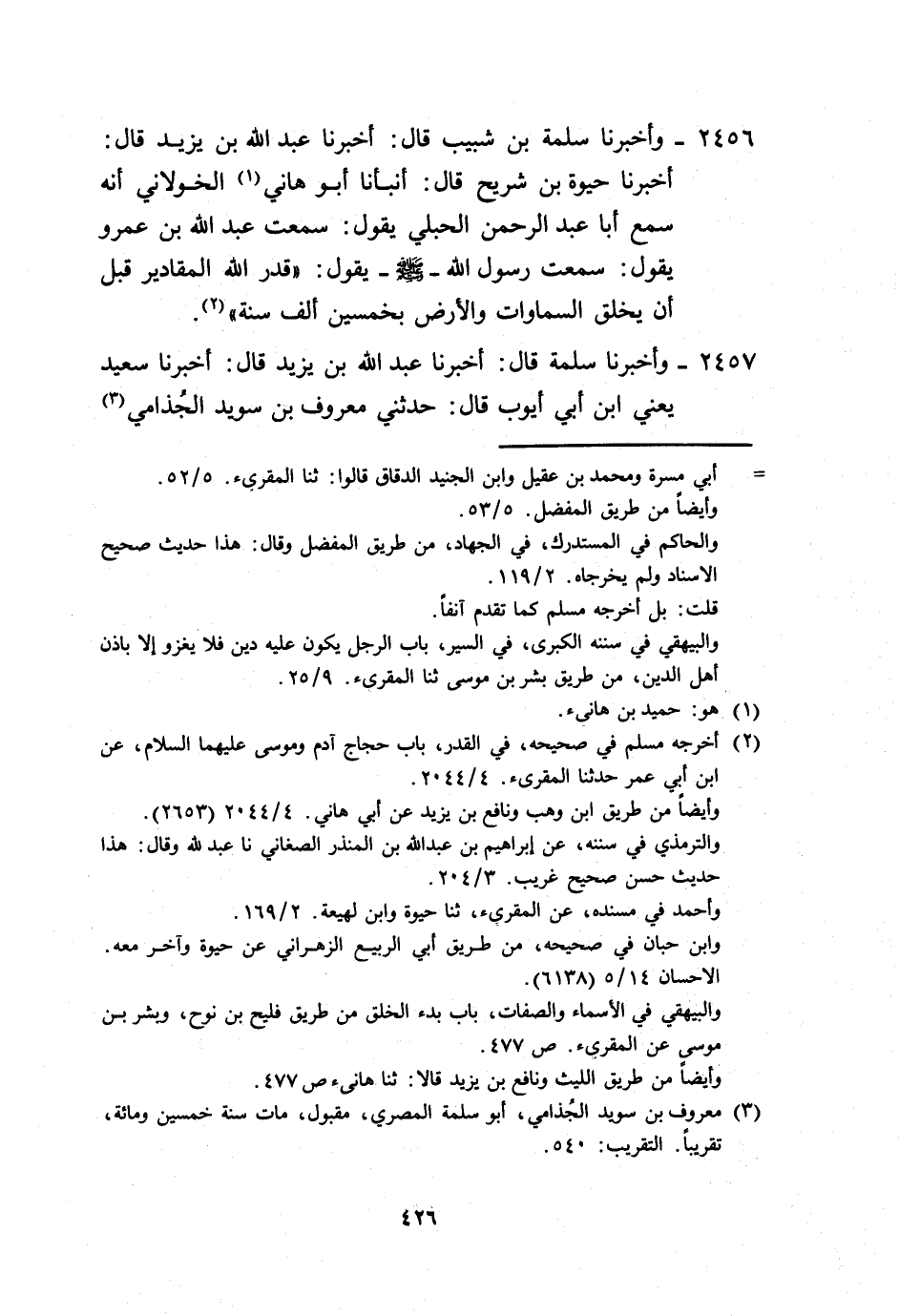 2456 - وَأَخْبَرَنَا سَلَمَةُ بْنُ شَبِيبٍ، قَالَ: أَخْبَرَنَا عَبْدُ اللَّهِ بْنُ يَزِيدَ، قَالَ: أَخْبَرَنَا حَيْوَةُ بْنُ شُرَيْحٍ، قَالَ: أَنْبَأَنَا أَبُو هَانِئٍ الْخَوْلَانِيُّ، أَنَّهُ سَمِعَ أَبَا عَبْدِ الرَّحْمَنِ الْحُبُلِيَّ، يَقُولُ: سَمِعْتُ عَبْدَ اللَّهِ بْنَ عَمْرٍو، يَقُولُ: سَمِعْتُ رَسُولَ اللَّهِ صَلَّى اللهُ عَلَيْهِ وَسَلَّمَ يَقُولُ: «§قَدَّرَ اللَّهُ الْمَقَادِيرَ قَبْلَ أَنْ يَخْلُقَ السَّمَاوَاتِ وَالْأَرْضَ بِخَمْسِينَ أَلْفَ سَنَةٍ»