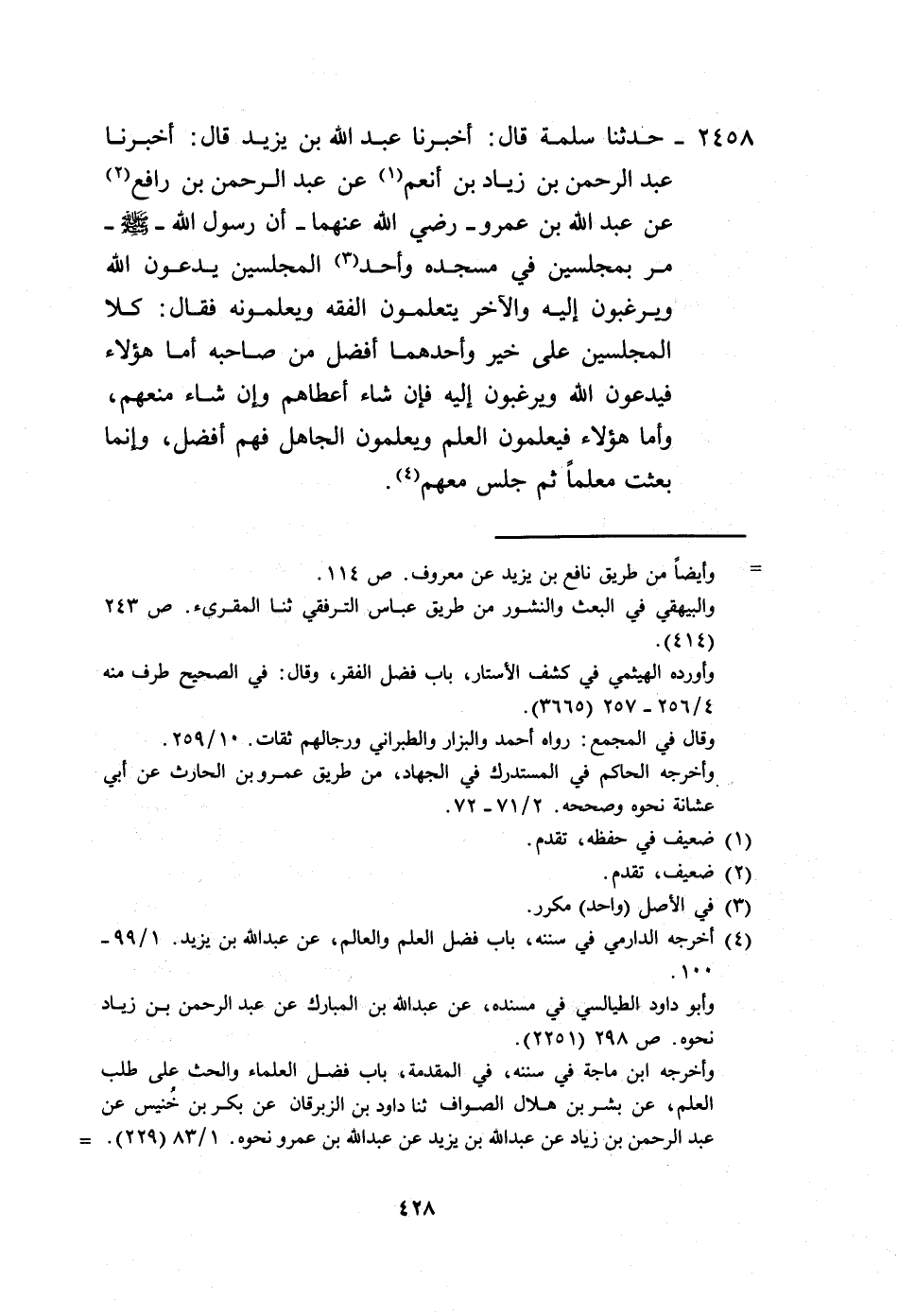 2458 - حَدَّثَنَا سَلَمَةُ، قَالَ: أَخْبَرَنَا عَبْدُ اللَّهِ بْنُ يَزِيدَ، قَالَ: أَخْبَرَنَا عَبْدُ الرَّحْمَنِ بْنُ زِيَادِ بْنِ أَنْعُمٍ، عَنْ عَبْدِ الرَّحْمَنِ بْنِ رَافِعٍ، عَنْ عَبْدِ اللَّهِ بْنِ عَمْرٍو رَضِيَ اللَّهُ عَنْهُمَا، أَنَّ رَسُولَ اللَّهِ صَلَّى اللهُ عَلَيْهِ وَسَلَّمَ مَرَّ بِمَجْلِسَيْنِ فِي مَسْجِدِهِ وَأَحَدُ الْمَجْلِسَيْنِ يَدْعُونَ اللَّهَ وَيَرْغَبُونَ إِلَيْهِ وَالْآخَرُ يَتَعَلَّمُونَ الْفِقْهَ وَيُعَلِّمُونَهُ، فَقَالَ: «§كِلَا الْمَجْلِسَيْنِ عَلَى خَيْرٍ وَأَحَدُهُمَا أَفْضَلُ مِنْ صَاحِبِهِ، أَمَّا هَؤُلَاءِ فَيَدْعُونَ اللَّهَ وَيَرْغَبُونَ إِلَيْهِ فَإِنْ شَاءَ أَعْطَاهُمْ وَإِنْ شَاءَ مَنَعَهُمْ، وَأَمَّا هَؤُلَاءِ فَيَعْلَمُونَ الْعِلْمَ وَيُعَلِّمُونَ الْجَاهِلَ فَهُمْ أَفْضَلُ وَإِنَّمَا بُعِثْتُ مُعَلِّمًا» ثُمَّ جَلَسَ مَعَهُمْ