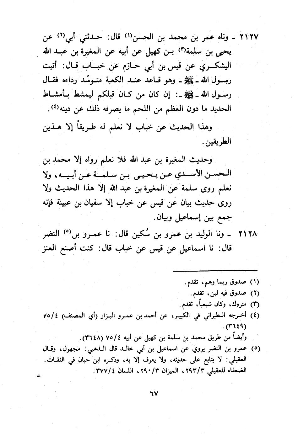 2127 - وَناه عُمَرُ بْنُ مُحَمَّدِ بْنِ الْحَسَنِ، قَالَ: حَدَّثَنِي أَبِي، عَنْ يَحْيَى بْنِ سَلَمَةَ بْنِ كُهَيْلٍ، عَنْ أَبِيهِ، عَنِ الْمُغِيرَةِ بْنِ عَبْدِ اللَّهِ الْيَشْكُرِيِّ، عَنْ قَيْسِ بْنِ أَبِي حَازِمٍ، عَنْ خَبَّابٍ، قَالَ: أَتَيْتُ رَسُولَ اللَّهِ صَلَّى اللهُ عَلَيْهِ وَسَلَّمَ وَهُوَ قَاعِدٌ عِنْدَ الْكَعْبَةِ مُتَوَسِّدٌ رِدَاءَهُ، فَقَالَ رَسُولُ اللَّهِ صَلَّى اللهُ عَلَيْهِ وَسَلَّمَ: «§إِنْ كَانَ مَنْ كَانَ قَبْلَكُمْ لَيُمَشَّطُ بِأَمْشَاطِ الْحَدِيدِ مَا دُونَ الْعَظْمِ مِنَ اللَّحْمِ مَا يَصْرِفُهُ ذَلِكَ عَنْ دِينِهِ» . وَهَذَا الْحَدِيثُ عَنْ خَبَّابٍ لَا نَعْلَمُ لَهُ طَرِيقًا إِلَّا هَذَيْنِ الطَّرِيقَيْنِ، وَحَدِيثُ الْمُغِيرَةِ بْنِ عَبْدِ اللَّهِ فَلَا نَعْلَمُ رَوَاهُ إِلَّا مُحَمَّدُ بْنُ الْحَسَنِ الْأَسَدِيُّ، عَنْ يَحْيَى بْنِ سَلَمَةَ، عَنْ أَبِيهِ وَلَا نَعْلَمُ رَوَى سَلَمَةُ، عَنِ الْمُغِيرَةِ بْنِ عَبْدِ اللَّهِ إِلَّا هَذَا الْحَدِيثَ وَلَا رَوَى حَدِيثَ بَيَانٍ، عَنْ قَيْسٍ، عَنْ خَبَّابٍ إِلَّا سُفْيَانُ بْنُ عُيَيْنَةَ فَإِنَّهُ جَمَعَ بَيْنَ إِسْمَاعِيلَ وَبَيَانٍ