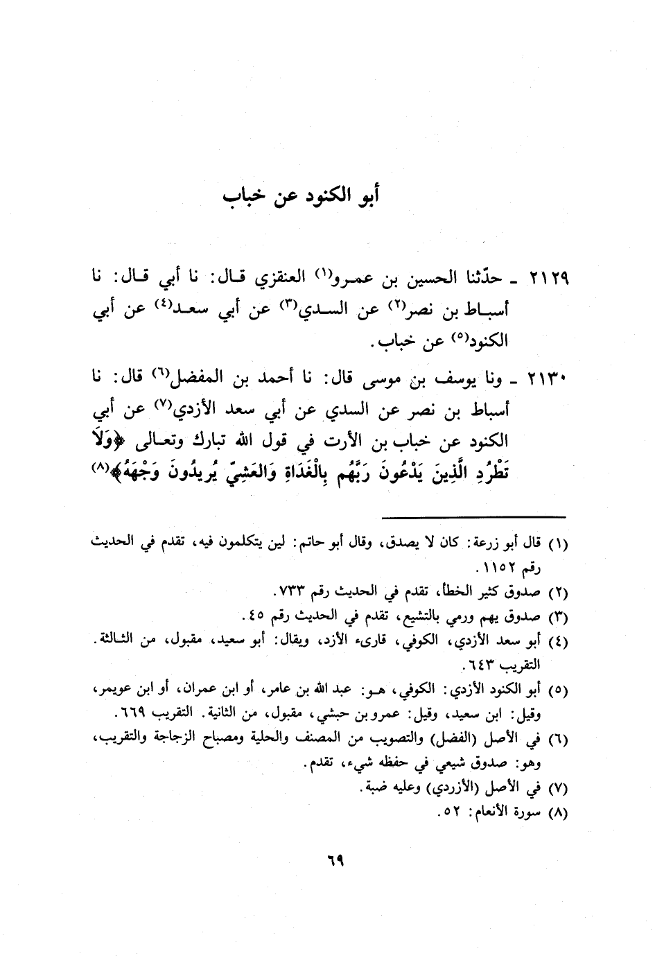 2129 - حَدَّثَنَا الْحُسَيْنُ بْنُ عَمْرٍو الْعَنْقَزِيُّ، قَالَ: نا أَبِي، قَالَ: نا أَسْبَاطُ بْنُ نَصْرٍ، عَنِ السُّدِّيِّ، عَنْ أَبِي سَعْدٍ، عَنْ أَبِي الْكَنُودِ، عَنْ خَبَّابٍ.