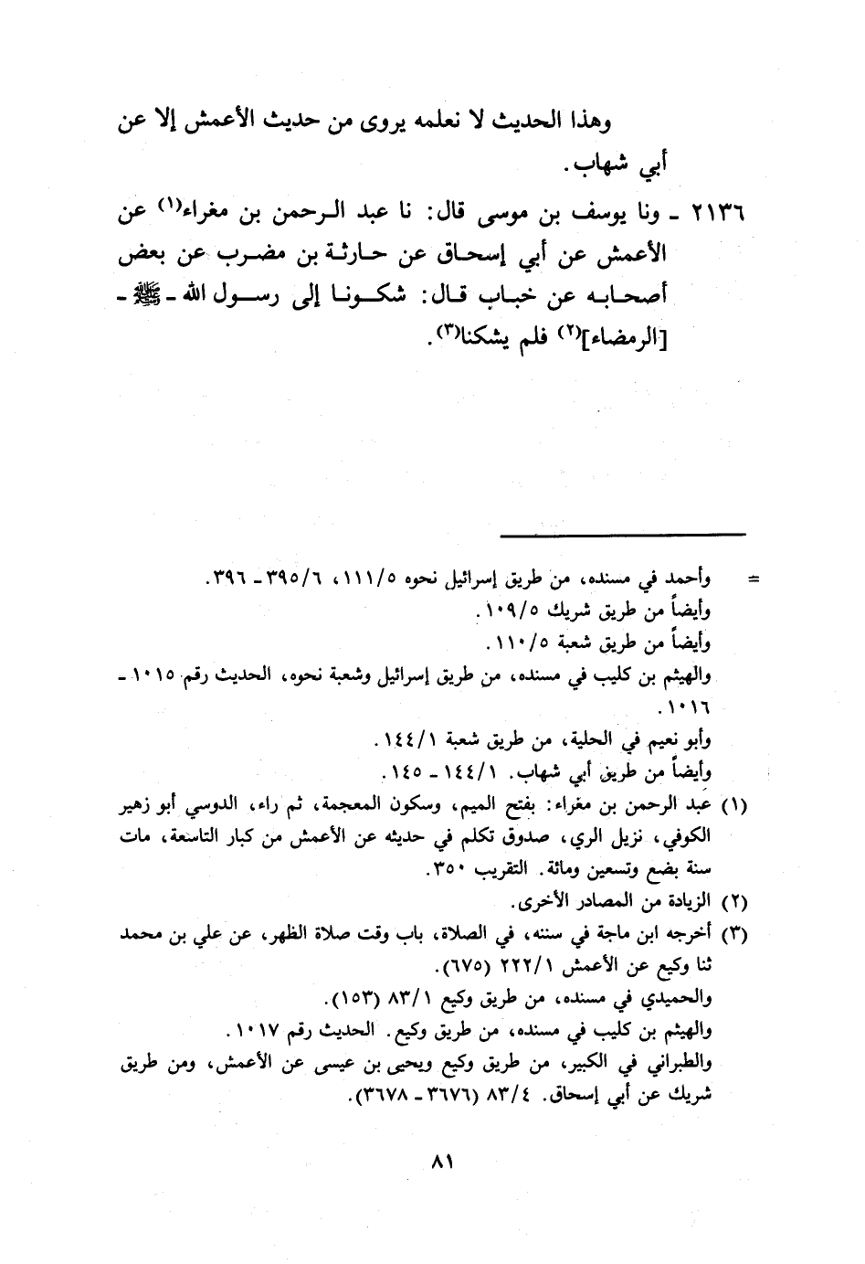 2136 - ونا يُوسُفُ بْنُ مُوسَى، قَالَ: نا عَبْدُ الرَّحْمَنِ بْنُ مَغْرَاءَ، عَنِ الْأَعْمَشِ، عَنْ أَبِي إِسْحَاقَ، عَنْ حَارِثَةَ بْنِ مُضَرِّبٍ، عَنْ بَعْضِ، أَصْحَابِهِ، عَنْ خَبَّابٍ، قَالَ: «§شَكَوْنَا إِلَى رَسُولِ اللَّهِ صَلَّى اللهُ عَلَيْهِ وَسَلَّمَ الرَّمْضَاءَ فَلَمْ يُشْكِنَا»