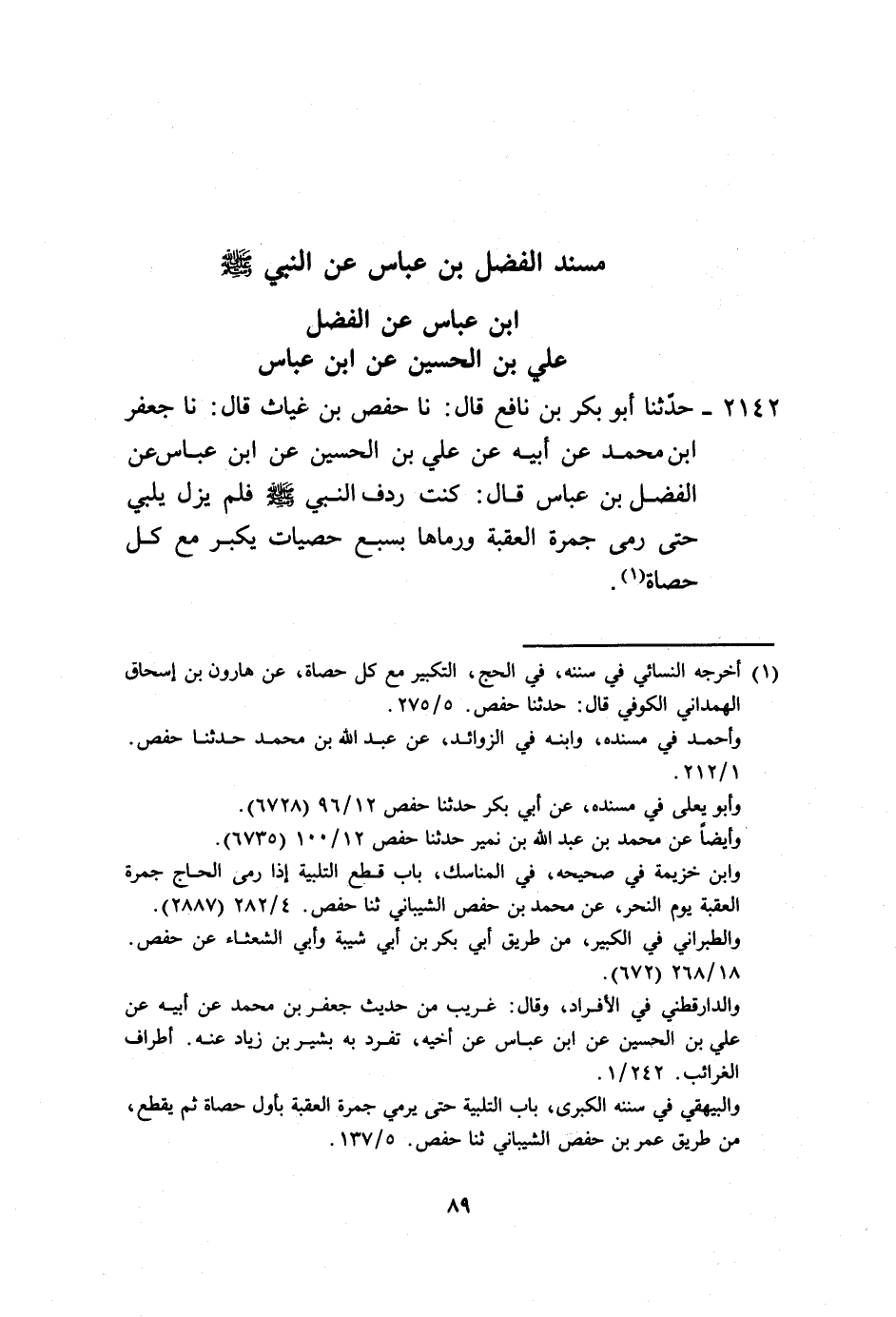 2142 - حَدَّثَنَا أَبُو بَكْرِ بْنُ نَافِعٍ، قَالَ: نا حَفْصُ بْنُ غِيَاثٍ، قَالَ: نا جَعْفَرُ بْنُ مُحَمَّدٍ، عَنْ أَبِيهِ، عَنْ عَلِيِّ بْنِ الْحُسَيْنِ، عَنِ ابْنِ عَبَّاسٍ، عَنِ الْفَضْلِ بْنِ عَبَّاسٍ، قَالَ: كُنْتُ رِدْفَ النَّبِيِّ صَلَّى اللهُ عَلَيْهِ وَسَلَّمَ «§فَلَمْ يَزَلْ يُلَبِّي حَتَّى رَمَى جَمْرَةَ الْعَقَبَةِ وَرَمَاهَا بِسَبْعِ حَصَيَاتٍ يُكَبِّرُ مَعَ كُلِّ حَصَاةٍ» -[90]-. وَهَذَا الْحَدِيثُ عَنِ الْفَضْلِ، عَنِ النَّبِيِّ صَلَّى اللهُ عَلَيْهِ وَسَلَّمَ أَنَّهُ رَمَى الْجَمْرَةَ بِسَبْعِ حَصَيَاتٍ يُكَبِّرُ مَعَ كُلِّ حَصَاةٍ، لَا نَعْلَمُ رَوَاهُ إِلَّا عَلِيُّ بْنُ الْحُسَيْنِ، عَنِ ابْنِ عَبَّاسٍ، عَنِ الْفَضْلِ وَلَا نَعْلَمُ حَدَّثَ بِهِ، عَنْ جَعْفَرٍ إِلَّا حَفْصُ بْنُ غِيَاثٍ