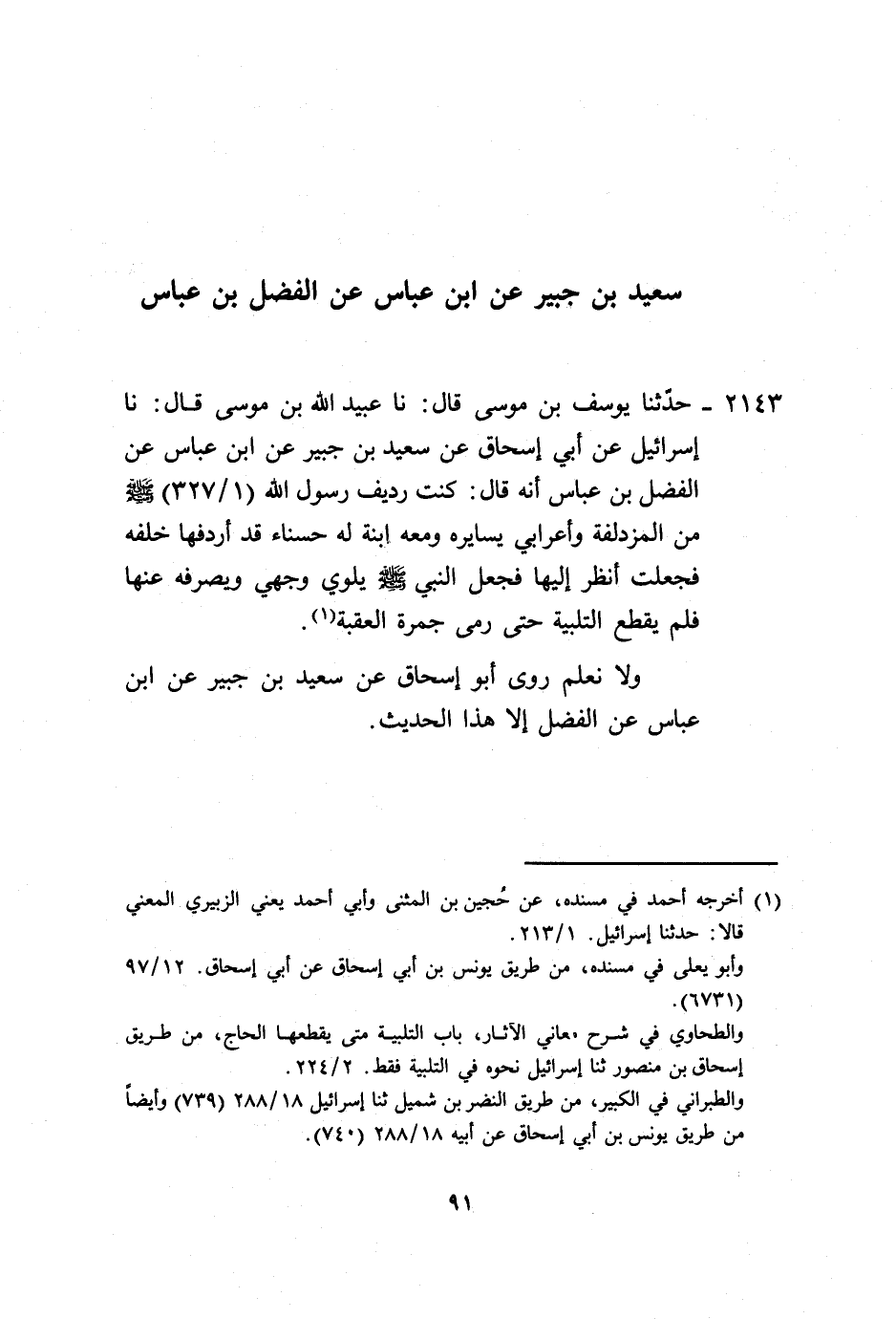 2143 - حَدَّثَنَا يُوسُفُ بْنُ مُوسَى، قَالَ: نا عُبَيْدُ اللَّهِ بْنُ مُوسَى، قَالَ: نا إِسْرَائِيلُ، عَنْ أَبِي إِسْحَاقَ، عَنْ سَعِيدِ بْنِ جُبَيْرٍ، عَنِ ابْنِ عَبَّاسٍ، عَنِ الْفَضْلِ بْنِ عَبَّاسٍ، أَنَّهُ قَالَ: «كُنْتُ رَدِيفَ رَسُولِ اللَّهِ صَلَّى اللهُ عَلَيْهِ وَسَلَّمَ مِنَ الْمُزْدَلِفَةِ وَأَعْرَابِيٌّ يُسَايِرُهُ وَمَعَهُ ابْنَةٌ لَهُ حَسْنَاءُ قَدْ أَرْدَفَهَا خَلْفَهُ، فَجَعَلْتُ أَنْظُرُ إِلَيْهَا فَجَعَلَ النَّبِيُّ صَلَّى اللهُ عَلَيْهِ وَسَلَّمَ §يَلْوِي وَجْهِي وَيَصْرِفُهُ عَنْهَا فَلَمْ يَقْطَعِ التَّلْبِيَةَ حَتَّى رَمَى جَمْرَةَ الْعَقَبَةِ» . وَلَا نَعْلَمُ رَوَى أَبُو إِسْحَاقَ، عَنْ سَعِيدِ بْنِ جُبَيْرٍ، عَنِ ابْنِ عَبَّاسٍ، عَنِ الْفَضْلِ إِلَّا هَذَا الْحَدِيثَ
