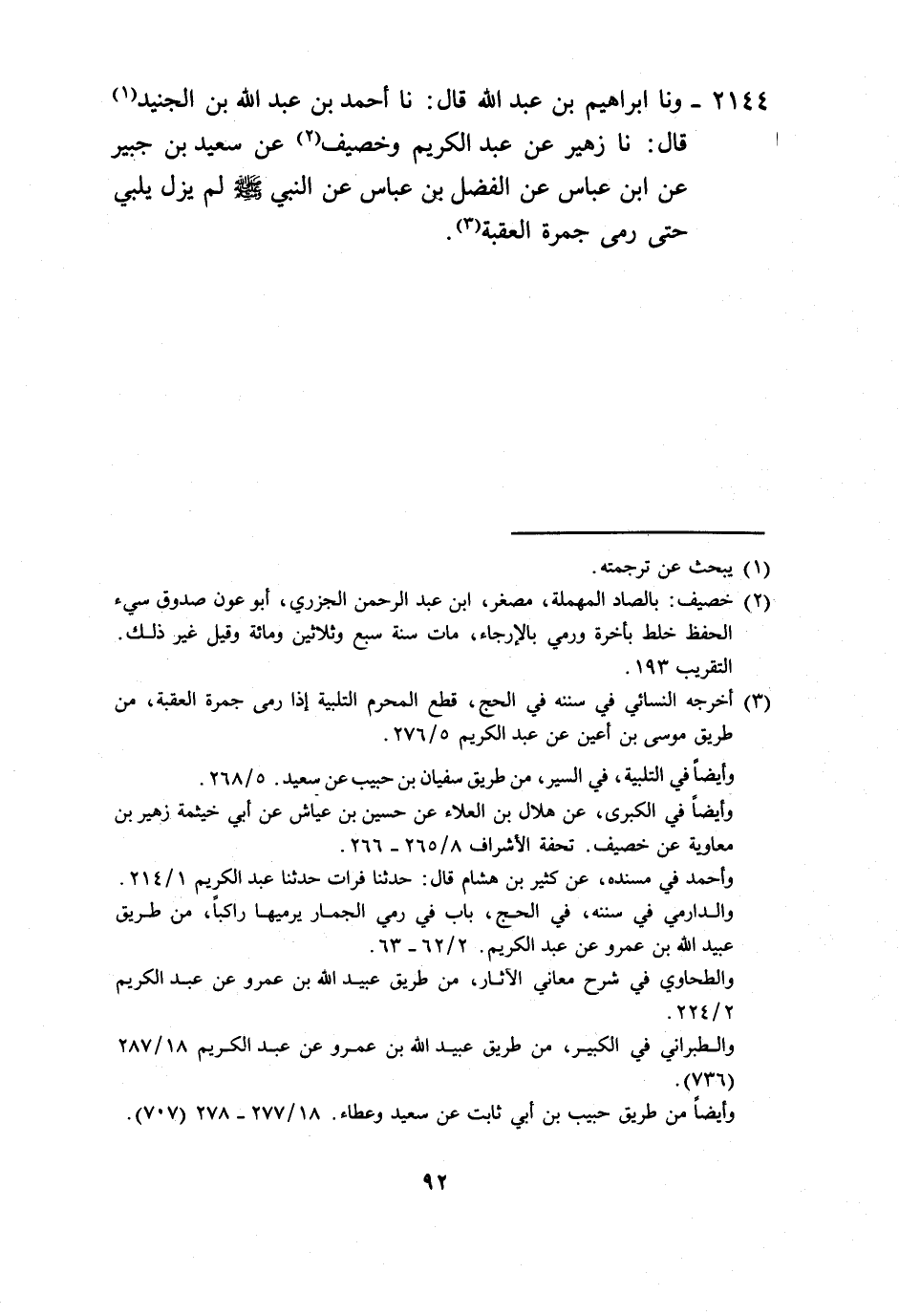 2144 - ونا إِبْرَاهِيمُ بْنُ عَبْدِ اللَّهِ، قَالَ: نا أَحْمَدُ بْنُ عَبْدِ اللَّهِ بْنِ الْجُنَيْدِ، قَالَ: نا زُهَيْرٌ، عَنْ عَبْدِ الْكَرِيمِ، وَخُصَيْفٌ، عَنْ سَعِيدِ بْنِ جُبَيْرٍ، عَنِ ابْنِ عَبَّاسٍ، عَنِ الْفَضْلِ بْنِ عَبَّاسٍ، عَنِ النَّبِيِّ صَلَّى اللهُ عَلَيْهِ وَسَلَّمَ «§لَمْ يَزَلْ يُلَبِّي حَتَّى رَمَى جَمْرَةَ الْعَقَبَةِ»