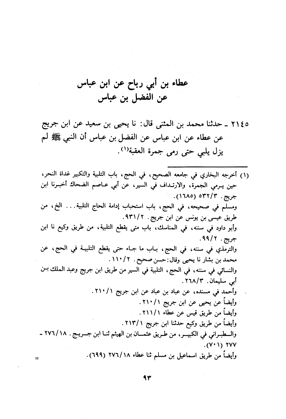 2145 - حَدَّثَنَا مُحَمَّدُ بْنُ الْمُثَنَّى، قَالَ: نا يَحْيَى بْنُ سَعِيدٍ، عَنِ ابْنِ جُرَيْجٍ، عَنْ عَطَاءٍ، عَنِ ابْنِ عَبَّاسٍ، عَنِ الْفَضْلِ بْنِ عَبَّاسٍ، أَنَّ النَّبِيَّ صَلَّى اللهُ عَلَيْهِ وَسَلَّمَ «§لَمْ يَزَلْ يُلَبِّي حَتَّى رَمَى جَمْرَةَ الْعَقَبَةِ»