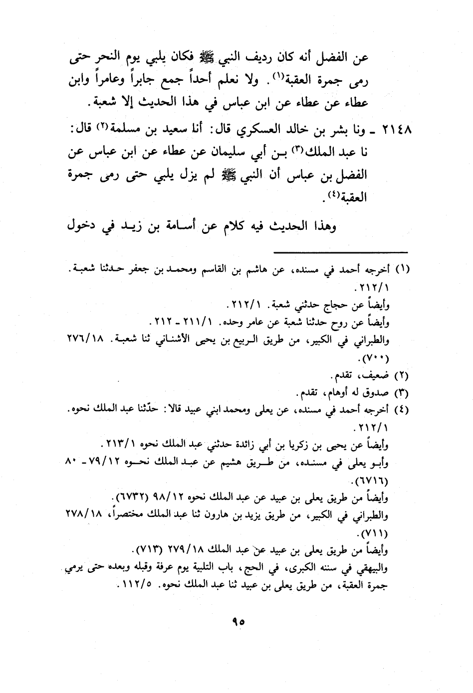 2148 - ونا بِشْرُ بْنُ خَالِدٍ الْعَسْكَرِيُّ، قَالَ: أنا سَعِيدُ بْنُ مَسْلَمَةَ، قَالَ: نا عَبْدُ الْمَلِكِ بْنُ أَبِي سُلَيْمَانَ، عَنْ عَطَاءٍ، عَنِ ابْنِ عَبَّاسٍ، عَنِ الْفَضْلِ بْنِ عَبَّاسٍ، أَنَّ النَّبِيَّ صَلَّى اللهُ عَلَيْهِ وَسَلَّمَ «§لَمْ يَزَلْ يُلَبِّي حَتَّى رَمَى جَمْرَةَ الْعَقَبَةِ» . وَهَذَا الْحَدِيثُ فِيهِ كَلَامٌ، عَنْ أُسَامَةَ بْنِ زَيْدٍ فِي دُخُولِ -[96]- الْبَيْتِ فَاخْتَصَرْنَا مِنْهُ مَا كَانَ عَنِ الْفَضْلِ