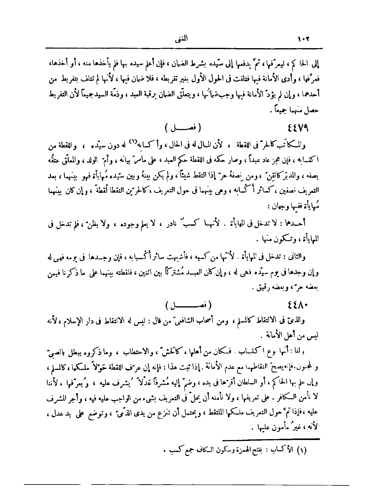 (٤٥٣٩) فَصْلٌ: وَالْمُكَاتَبُ كَالْحُرِّ فِي اللُّقَطَةِ؛ لِأَنَّ الْمَالَ لَهُ فِي الْحَالِ، وَأَكْسَابُهُ لَهُ دُونَ سَيِّدِهِ، وَاللُّقَطَةُ مِنْ أَكْسَابِهِ، فَإِنْ عَجَزَ عَادَ عَبْدًا، وَصَارَ حُكْمُهُ فِي اللُّقَطَةِ حُكْمَ الْعَبْدِ، عَلَى مَا مَرَّ بَيَانُهُ. وَأُمُّ الْوَلَدِ، وَالْمُعَلَّقُ عِتْقُهُ بِصِفَةٍ، وَالْمُدَبَّرُ كَالْقِنِّ. وَمَنْ نِصْفُهُ حُرٌّ إذَا الْتَقَطَ شَيْئًا، وَلَمْ يَكُنْ بَيْنَهُ وَبَيْنَ سَيِّدِهِ مُهَايَأَةٌ، فَهُوَ بَيْنَهُمَا بَعْدَ التَّعْرِيفِ نِصْفَيْنِ، كَسَائِرِ أَكْسَابِهِ، وَهِيَ بَيْنَهُمَا فِي حَوْلِ التَّعْرِيفِ كَالْحُرَّيْنِ إذَا الْتَقَطَا لُقَطَةً، وَإِنْ كَانَ بَيْنَهُمَا مُهَايَأَةٌ، فَفِيهَا وَجْهَانِ أَحَدُهُمَا لَا تَدْخُلُ فِي الْمُهَايَأَةِ؛ لِأَنَّهَا كَسْبٌ نَادِرٌ، لَا يُعْلَمُ وُجُودُهُ وَلَا يُظَنُّ، فَلَمْ تَدْخُلْ فِي الْمُهَايَأَةِ، وَتَكُونُ بَيْنَهُمَا