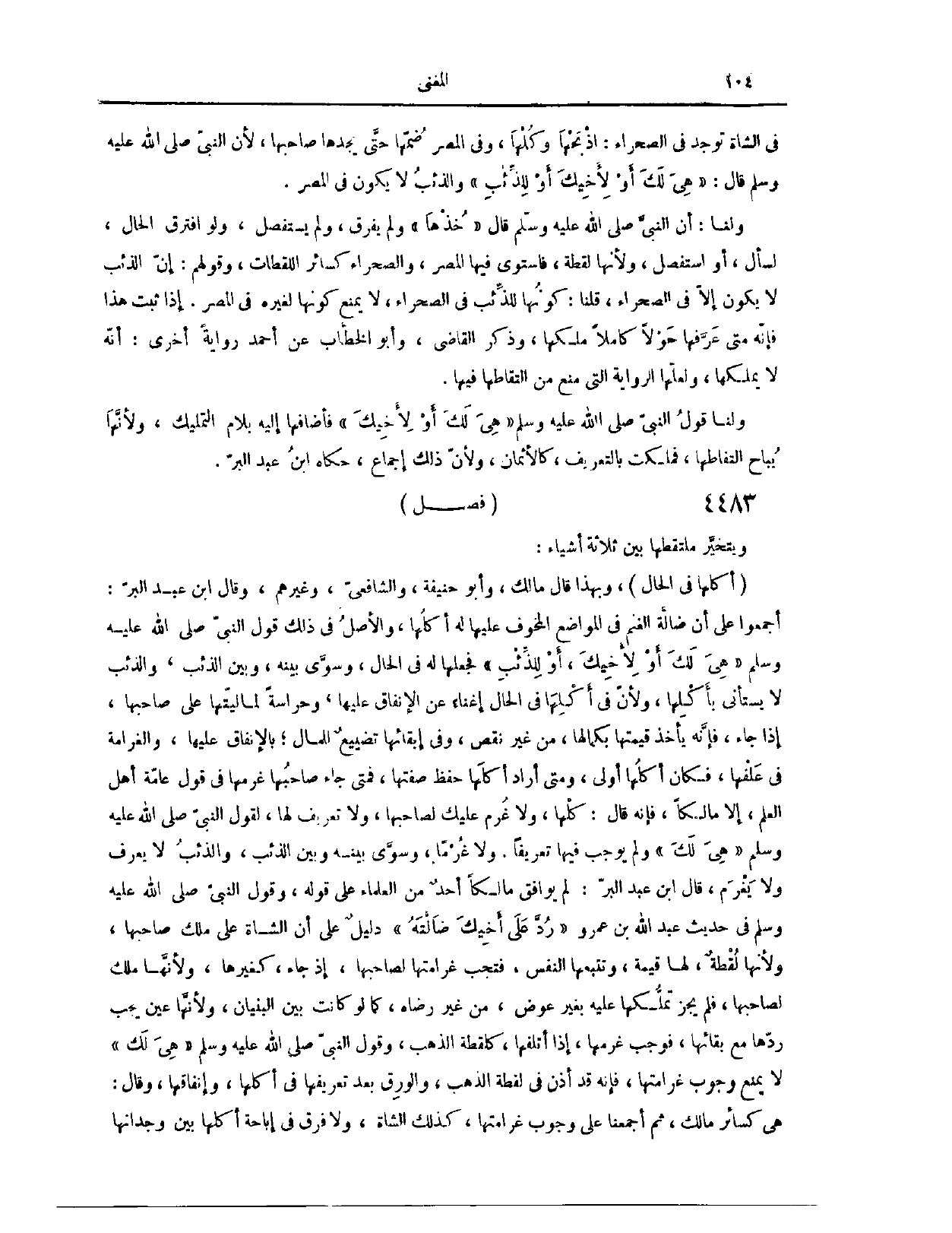 (٤٥٤٣) فَصْلٌ: وَيَتَخَيَّرُ مُلْتَقِطُهَا بَيْنَ ثَلَاثَةِ أَشْيَاءَ؛ أَكْلُهَا فِي الْحَالِ. وَبِهَذَا قَالَ مَالِكٌ، وَأَبُو حَنِيفَةَ، وَالشَّافِعِيُّ، وَغَيْرُهُمْ. قَالَ ابْنُ عَبْدِ الْبَرِّ: أَجْمَعُوا عَلَى أَنَّ ضَالَّةَ الْغَنَمِ، فِي الْمَوْضِعِ الْمَخُوفِ عَلَيْهَا، لَهُ أَكْلُهَا. وَالْأَصْلُ فِي ذَلِكَ قَوْلُ النَّبِيِّ - صَلَّى اللَّهُ عَلَيْهِ وَسَلَّمَ -: «هِيَ لَكَ أَوْ لِأَخِيكَ أَوْ لِلذِّئْبِ» . فَجَعَلَهَا لَهُ فِي الْحَالِ، وَسَوَّى بَيْنَهُ وَبَيْنَ الذِّئْبِ، وَالذِّئْبُ لَا يَسْتَأْنِي بِأَكْلِهَا، وَلِأَنَّ فِي أَكْلِهَا فِي الْحَالِ إغْنَاءً عَنْ الْإِنْفَاقِ عَلَيْهَا، وَحِرَاسَةً لِمَالِيَّتِهَا عَلَى صَاحِبِهَا إذَا جَاءَ.