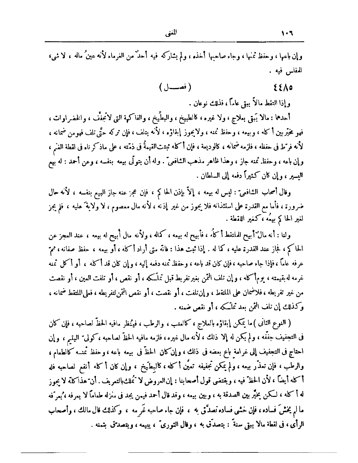 (٤٥٤٥) فَصْلٌ: وَإِذَا الْتَقَطَ مَا لَا يَبْقَى عَامًا، فَذَلِكَ نَوْعَانِ؛ أَحَدُهُمَا مَا لَا يَبْقَى بِعِلَاجٍ وَلَا غَيْرِهِ، كَالطَّبِيخِ، وَالْبِطِّيخِ، وَالْفَاكِهَةِ الَّتِي لَا تُجَفَّفُ، وَالْخَضْرَاوَاتِ. فَهُوَ مُخَيَّرٌ بَيْنَ أَكْلِهِ، وَبَيْعِهِ وَحِفْظِ ثَمَنِهِ، وَلَا يَجُوزُ إبْقَاؤُهُ؛ لِأَنَّهُ يَتْلَفُ. فَإِنْ تَرَكَهُ حَتَّى تَلِفَ، فَهُوَ مِنْ ضَمَانِهِ؛ لِأَنَّهُ فَرَّطَ فِي حِفْظِهِ، فَلَزِمَهُ ضَمَانُهُ، كَالْوَدِيعَةِ. فَإِنْ أَكَلَهُ ثَبَتَتْ الْقِيمَةُ فِي ذِمَّتِهِ، عَلَى مَا ذَكَرْنَاهُ فِي لُقَطَةِ الْغَنَمِ. وَإِنْ بَاعَهُ وَحَفِظَ ثَمَنَهُ، جَازَ