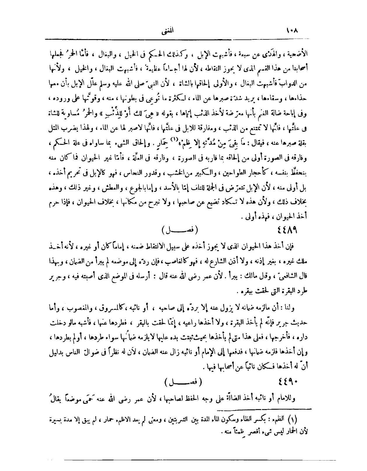 وَفِي إبَاحَةِ ضَالَّةِ الْغَنَمِ بِأَنَّهَا مُعَرَّضَةٌ لِأَخْذِ الذِّئْبِ إيَّاهَا، بِقَوْلِهِ: " هِيَ لَكَ، أَوْ لِأَخِيكَ، أَوْ لِلذِّئْبِ ". وَالْحُمُرُ مُسَاوِيَةٌ لِلشَّاةِ فِي عِلَّتِهَا، فَإِنَّهَا لَا تَمْتَنِعُ مِنْ الذِّئْبِ، وَمُفَارِقَةٌ لِلْإِبِلِ فِي عِلَّتِهَا، فَإِنَّهَا لَا صَبْرَ لَهَا عَنْ الْمَاءِ، وَلِهَذَا يُضْرَبُ الْمَثَلُ بِقِلَّةِ صَبْرِهَا عَنْهُ، فَيُقَالُ: مَا بَقِيَ مِنْ مُدَّتِهِ إلَّا ظَمَأُ حِمَارٍ. وَإِلْحَاقُ الشَّيْءِ بِمَا سَاوَاهُ فِي عِلَّةِ الْحُكْمِ وَفَارَقَهُ فِي الصُّورَةِ، أَوْلَى مِنْ إلْحَاقِهِ بِمَا قَارَبَهُ فِي الصُّورَةِ وَفَارَقَهُ فِي الْعِلَّةِ. فَأَمَّا غَيْرُ الْحَيَوَانِ، فَمَا كَانَ مِنْهُ يَنْحَفِظُ بِنَفْسِهِ، كَأَحْجَارِ الطَّوَاحِينِ، وَالْكَبِيرِ مِنْ الْخَشَبِ، وَقُدُورِ النُّحَاسِ، فَهُوَ كَالْإِبِلِ فِي تَحْرِيمِ أَخْذِهِ، بَلْ أَوْلَى مِنْهُ؛ لِأَنَّ الْإِبِلَ تَتَعَرَّضُ فِي الْجُمْلَةِ لِلتَّلَفِ.