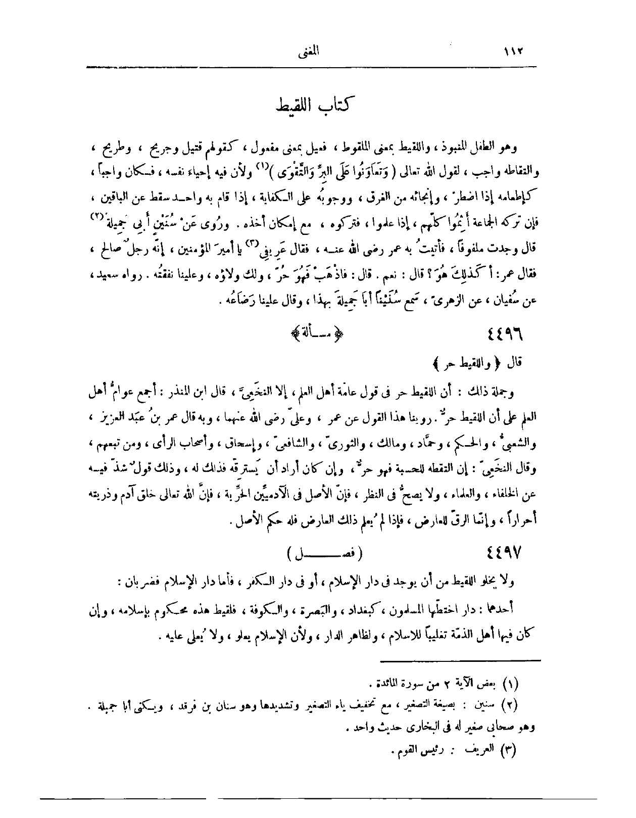 ِ وَهُوَ الطِّفْلُ الْمَنْبُوذُ. وَاللَّقِيطُ بِمَعْنَى الْمَلْقُوطِ، فَعِيلٌ بِمَعْنَى مَفْعُولٍ، كَقَوْلِهِمْ: قَتِيلٌ وَجَرِيحٌ وَطَرِيحٌ. وَالْتِقَاطُهُ وَاجِبٌ؛ لِقَوْلِ اللَّهِ تَعَالَى: {وَتَعَاوَنُوا عَلَى الْبِرِّ وَالتَّقْوَى} [المائدة: ٢] . وَلِأَنَّ فِيهِ إحْيَاءَ نَفْسِهِ، فَكَانَ وَاجِبًا، كَإِطْعَامِهِ إذَا اُضْطُرَّ، وَإِنْجَائِهِ مِنْ الْغَرَقِ. وَوُجُوبُهُ عَلَى الْكِفَايَةِ، إذَا قَامَ بِهِ وَاحِدٌ سَقَطَ عَنْ الْبَاقِينَ، فَإِنْ تَرَكَهُ الْجَمَاعَةُ، أَثِمُوا كُلُّهُمْ، إذَا عَلِمُوا فَتَرَكُوهُ مَعَ إمْكَانِ أَخْذِهِ
