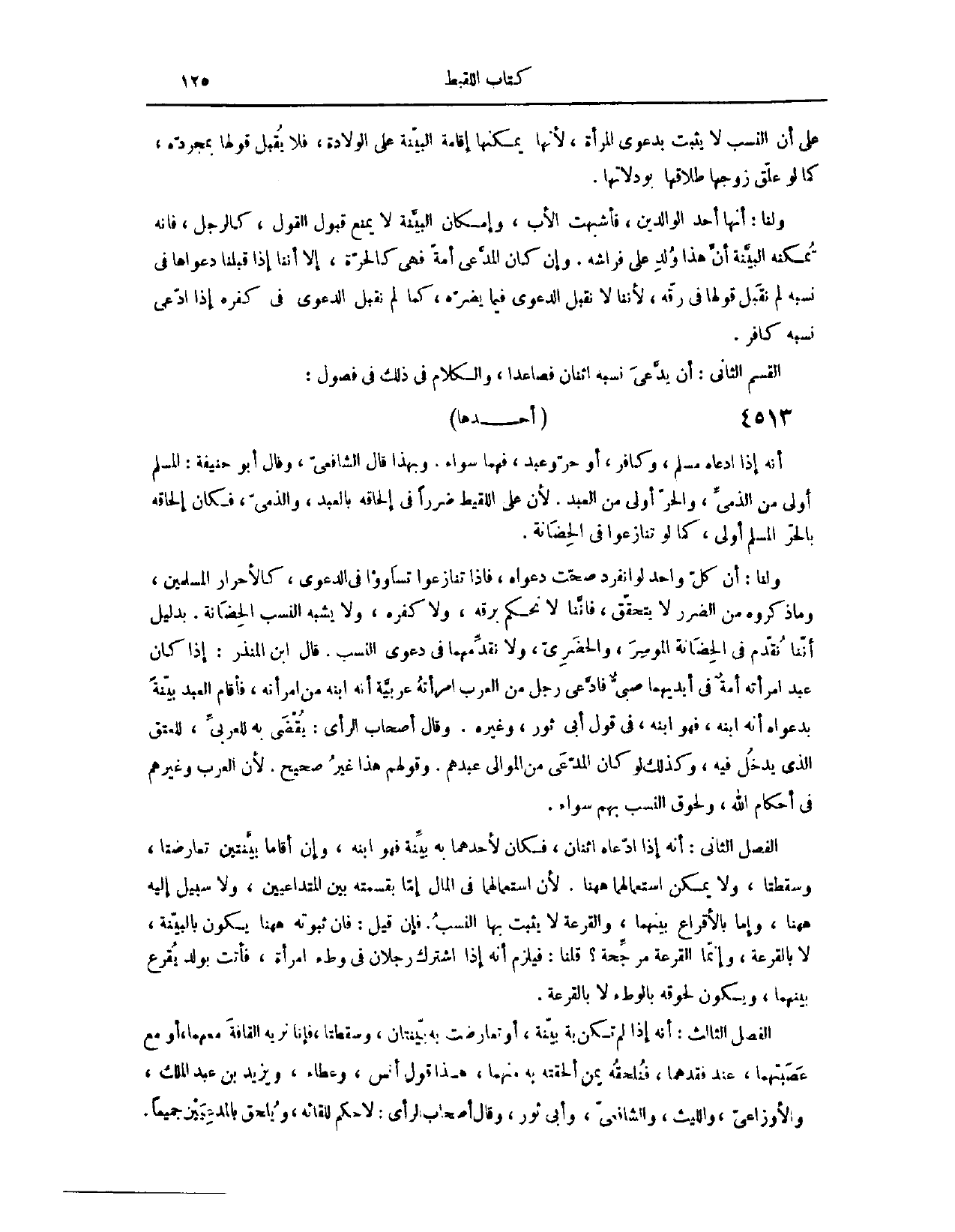 (٤٥٧٣) الْقِسْمُ الثَّانِي، أَنْ يَدَّعِيَ نَسَبَهُ اثْنَانِ فَصَاعِدًا، وَالْكَلَامُ فِي ذَلِكَ فِي فُصُولٍ: أَحَدُهَا أَنَّهُ إذَا ادَّعَاهُ مُسْلِمٌ وَكَافِرٌ، أَوْ حُرٌّ وَعَبْدٌ، فَهُمَا سَوَاءٌ. وَبِهَذَا قَالَ الشَّافِعِيُّ. وَقَالَ أَبُو حَنِيفَةَ: الْمُسْلِمُ أَوْلَى مِنْ الذِّمِّيِّ، وَالْحُرُّ أَوْلَى مِنْ الْعَبْدِ؛ لِأَنَّ عَلَى اللَّقِيطِ ضَرَرًا فِي إلْحَاقِهِ بِالْعَبْدِ وَالذِّمِّيِّ، فَكَانَ إلْحَاقُهُ بِالْحُرِّ الْمُسْلِمِ أَوْلَى، كَمَا لَوْ تَنَازَعُوا فِي الْحَضَانَةِ. وَلَنَا أَنَّ كُلَّ وَاحِدٍ مِنْهُمْ إذَا انْفَرَدَ صَحَّتْ دَعْوَاهُ، فَإِذَا تَنَازَعُوا، تَسَاوَوْا فِي الدَّعْوَى، كَالْأَحْرَارِ الْمُسْلِمِينَ. وَمَا ذَكَرُوهُ مِنْ الضَّرَرِ لَا يَتَحَقَّقُ، فَإِنَّنَا لَا نَحْكُمُ بِرِقِّهِ وَلَا كُفْرِهِ. وَلَا يُشْبِهُ النَّسَبُ الْحَضَانَةَ، بِدَلِيلِ أَنَّنَا نُقَدِّمُ فِي الْحَضَانَةِ الْمُوسِرَ وَالْحَضَرِيَّ، وَلَا نُقَدِّمُهُمَا فِي دَعْوَى النَّسَبِ. قَالَ ابْنُ الْمُنْذِرِ إذَا كَانَ عَبْدٌ، امْرَأَتُهُ أَمَةٌ، فِي أَيْدِيهِمَا صَبِيٌّ، فَادَّعَى رَجُلٌ مِنْ الْعَرَبِ امْرَأَتُهُ عَرَبِيَّةٌ أَنَّهُ ابْنُهُ مِنْ امْرَأَتِهِ، فَأَقَامَ الْعَبْدُ بَيِّنَةً بِدَعْوَاهُ أَنَّهُ ابْنُهُ، فَهُوَ ابْنُهُ فِي قَوْلِ أَبِي ثَوْرٍ وَغَيْرِهِ. وَقَالَ أَصْحَابُ الرَّأْيِ: يُقْضَى بِهِ لِلْعَرَبِيِّ، لِلْعِتْقِ الَّذِي يَدْخُلُ فِيهِ، وَكَذَلِكَ لَوْ كَانَ الْمُدَّعِي مِنْ الْمَوَالِي عَبْدَهُمْ. وَقَوْلُهُمْ هَذَا غَيْرُ صَحِيحٍ؛ لِأَنَّ الْعَرَبَ وَغَيْرَهُمْ فِي أَحْكَامِ اللَّهِ وَلُحُوقِ النَّسَبِ بِهِمْ سَوَاءٌ.