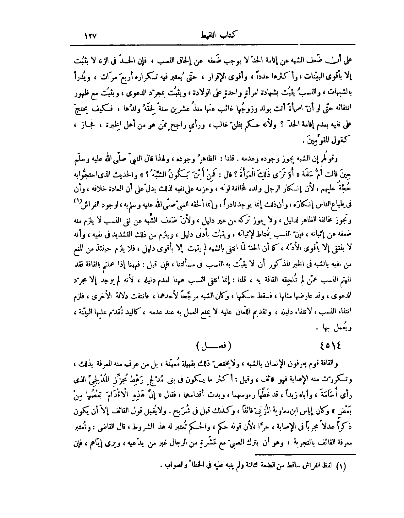 عَلَى أَنَّ ضَعْفَ الشَّبَهِ عَنْ إقَامَةِ الْحَدِّ لَا يُوجِبُ ضَعْفَهُ عَنْ إلْحَاقِ النَّسَبِ، فَإِنَّ الْحَدَّ فِي الزِّنَى لَا يَثْبُتُ إلَّا بِأَقْوَى الْبَيِّنَاتِ، وَأَكْثَرِهَا عَدَدًا، وَأَقْوَى الْإِقْرَارِ، حَتَّى يُعْتَبَرَ فِيهِ تَكْرَارُهُ أَرْبَعَ مَرَّاتٍ، وَيُدْرَأُ بِالشُّبُهَاتِ، وَالنَّسَبُ يَثْبُتُ بِشَهَادَةِ امْرَأَةٍ وَاحِدَةٍ عَلَى الْوِلَادَةِ، وَيَثْبُتُ بِمُجَرَّدِ الدَّعْوَى، وَيَثْبُتُ مَعَ ظُهُورِ انْتِفَائِهِ، حَتَّى لَوْ أَنَّ امْرَأَةً أَتَتْ بِوَلَدٍ وَزَوْجُهَا غَائِبٌ عَنْهَا مُنْذُ عِشْرِينَ سَنَةً، لَحِقَهُ وَلَدُهَا، فَكَيْفَ يُحْتَجُّ عَلَى نَفْيِهِ بِعَدَمِ إقَامَةِ الْحَدِّ، وَلِأَنَّهُ حُكْمٌ بِظَنٍّ غَالِبٍ، وَرَأْيٍ رَاجِحٍ، مِمَّنْ هُوَ مِنْ أَهْلِ الْخِبْرَةِ، فَجَازَ، كَقَوْلِ الْمُقَوِّمِينَ، وَقَوْلُهُمْ: إنَّ الشَّبَهَ يَجُوزُ وُجُودُهُ وَعَدَمُهُ. قُلْنَا: الظَّاهِرُ وُجُودُهُ، وَلِهَذَا «قَالَ: النَّبِيُّ - صَلَّى اللَّهُ عَلَيْهِ وَسَلَّمَ - حِينَ قَالَتْ أُمُّ سَلَمَةَ: أَوَ تَرَى ذَلِكَ الْمَرْأَةُ؟ قَالَ: فَمِنْ أَيْنَ يَكُونُ الشَّبَهُ؟» . وَالْحَدِيثُ الَّذِي احْتَجُّوا بِهِ حُجَّةٌ عَلَيْهِمْ؛ لِأَنَّ إنْكَارَ الرَّجُلِ وَلَدَهُ لِمُخَالَفَةِ لَوْنِهِ، وَعَزْمِهِ عَلَى نَفْيِهِ لِذَلِكَ، يَدُلُّ عَلَى أَنَّ الْعَادَةَ خِلَافُهُ، وَأَنَّ فِي طِبَاعِ النَّاسِ إنْكَارَهُ، وَأَنَّ ذَلِكَ إنَّمَا يُوجَدُ نَادِرًا، وَإِنَّمَا أَلْحَقَهُ النَّبِيُّ - صَلَّى اللَّهُ عَلَيْهِ وَسَلَّمَ - بِهِ لِوُجُودِ الْفِرَاشِ، وَتَجُوزُ مُخَالَفَةُ الظَّاهِرِ لِدَلِيلٍ، وَلَا يَجُوزُ تَرْكُهُ مِنْ غَيْرِ دَلِيلٍ، وَلِأَنَّ ضَعْفَ الشَّبَهِ عَنْ نَفْيِ النَّسَبِ لَا يَلْزَمُ مِنْهُ ضَعْفُهُ عَنْ إثْبَاتِهِ، فَإِنَّ النَّسَبَ يُحْتَاطُ لِإِثْبَاتِهِ، وَيَثْبُتُ بِأَدْنَى دَلِيلٍ، وَيَلْزَمُ مِنْ ذَلِكَ التَّشْدِيدُ فِي نَفْيِهِ، وَأَنَّهُ لَا يَنْتَفِي إلَّا بِأَقْوَى الْأَدِلَّةِ، كَمَا أَنَّ الْحَدَّ لَمَّا انْتَفَى بِالشَّبَهِ، لَمْ يَثْبُتْ إلَّا بِأَقْوَى دَلِيلٍ، فَلَا يَلْزَمُ حِينَئِذٍ مِنْ الْمَنْعِ مِنْ نَفْيِهِ بِالشَّبَهِ فِي الْخَبَرِ الْمَذْكُورِ، أَنْ لَا يَثْبُتَ بِهِ النَّسَبُ فِي مَسْأَلَتِنَا. فَإِنْ قِيلَ: فَهَاهُنَا إنْ عَمِلْتُمْ بِالْقَافَةِ فَقَدْ نَفَيْتُمْ النَّسَبَ عَمَّنْ لَمْ تُلْحِقْهُ الْقَافَةُ بِهِ. قُلْنَا: إنَّمَا انْتَفَى النَّسَبُ هَا هُنَا لِعَدَمِ دَلِيلِهِ؛ لِأَنَّهُ لَمْ يُوجَدْ إلَّا مُجَرَّدُ الدَّعْوَى، وَقَدْ عَارَضَهَا مِثْلُهَا، فَسَقَطَ حُكْمُهَا، وَكَانَ الشَّبَهُ مُرَجِّحًا لِأَحَدِهِمَا، فَانْتَفَتْ دَلَالَةٌ أُخْرَى، فَلَزِمَ انْتِفَاءُ النَّسَبِ لِانْتِفَاءِ دَلِيلِهِ، وَتَقْدِيمُ اللِّعَانِ عَلَيْهِ لَا يَمْنَعُ الْعَمَلَ بِهِ عِنْدَ عَدَمِهِ، كَالْيَدِ تُقَدَّمُ عَلَيْهَا الْبَيِّنَةُ، وَيُعْمَلُ بِهَا.