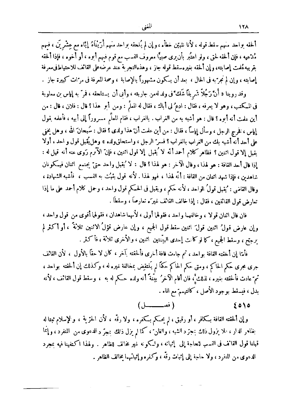 (٤٥٧٧) فَصْلٌ: وَإِنْ أَلْحَقَتْهُ الْقَافَةُ بِكَافِرٍ أَوْ رَقِيقٍ، لَمْ يُحْكَمْ بِكُفْرِهِ وَلَا رِقِّهِ؛ لِأَنَّ الْحُرِّيَّةَ وَالْإِسْلَامَ ثَبَتَا لَهُ بِظَاهِرِ الدَّارِ، فَلَا يَزُولُ ذَلِكَ بِمُجَرَّدِ الشَّبَهِ وَالظَّنِّ، كَمَا لَمْ يَزُلْ ذَلِكَ بِمُجَرَّدِ الدَّعْوَى مِنْ الْمُنْفَرِدِ. وَإِنَّمَا قَبِلْنَا قَوْلَ الْقَائِفِ فِي النَّسَبِ، لِلْحَاجَةِ إلَى إثْبَاتِهِ، وَلِكَوْنِهِ غَيْرَ مُخَالِفٍ لِلظَّاهِرِ، وَلِهَذَا اكْتَفَيْنَا فِيهِ بِمُجَرَّدِ الدَّعْوَى مِنْ الْمُنْفَرِدِ، وَلَا حَاجَةَ إلَى إثْبَاتِ رِقِّهِ وَكُفْرِهِ، وَإِثْبَاتُهُمَا يُخَالِفُ الظَّاهِرَ.