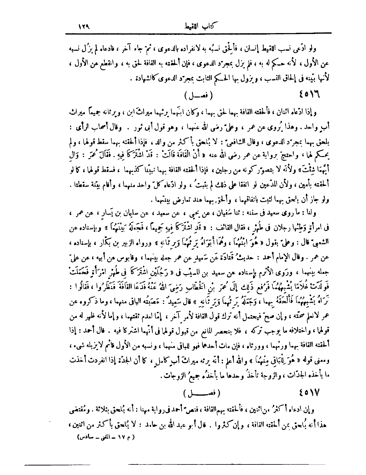 (٤٥٧٨) فَصْلٌ: وَإِذَا ادَّعَاهُ اثْنَانِ، فَأَلْحَقَتْهُ الْقَافَةُ بِهِمَا، لَحِقَ بِهِمَا، وَكَانَ ابْنَهُمَا، يَرِثُهُمَا مِيرَاثَ ابْنٍ، وَيَرِثَانِهِ جَمِيعًا مِيرَاثَ أَبٍ وَاحِدٍ. وَهَذَا يُرْوَى عَنْ عُمَرَ، وَعَلِيٍّ - رَضِيَ اللَّهُ عَنْهُمَا -. وَهُوَ قَوْلُ أَبِي ثَوْرٍ. وَقَالَ أَصْحَابُ الرَّأْيِ: يُلْحَقُ بِهِمَا بِمُجَرَّدِ الدَّعْوَى. وَقَالَ الشَّافِعِيُّ: لَا يُلْحَقُ بِأَكْثَرَ مِنْ وَالِدٍ، فَإِذَا أَلْحَقَتْهُ بِهِمَا سَقَطَ قَوْلُهُمَا، وَلَمْ يُحْكَمْ لَهُمَا. وَاحْتَجَّ بِرِوَايَةٍ عَنْ عُمَرَ - رَضِيَ اللَّهُ عَنْهُ - أَنَّ الْقَافَةَ قَالَتْ: قَدْ اشْتَرَكَا فِيهِ. فَقَالَ عُمَرُ: وَالِ أَيَّهُمَا شِئْت. وَلِأَنَّهُ لَا يُتَصَوَّرُ كَوْنُهُ مِنْ رَجُلَيْنِ، فَإِذَا أَلْحَقَتْهُ الْقَافَةُ بِهِمَا، تَبَيَّنَّا كَذِبَهُمَا، فَسَقَطَ قَوْلُهُمَا، كَمَا لَوْ أَلْحَقَتْهُ بِأُمَّيْنِ، وَلِأَنَّ الْمُدَّعِيَيْنِ لَوْ اتَّفَقَا عَلَى ذَلِكَ، لَمْ يَثْبُتْ، وَلَوْ ادَّعَاهُ كُلُّ وَاحِدٍ مِنْهُمَا، وَأَقَامَ بَيِّنَةً، سَقَطَتَا، وَلَوْ جَازَ أَنْ يُلْحَقَ بِهِمَا، لَثَبَتَ بِاتِّفَاقِهِمَا، وَأُلْحِقَ بِهِمَا عِنْدَ تَعَارُضِ بَيِّنَتِهِمَا. وَلَنَا مَا رَوَى سَعِيدٌ، فِي " سُنَنِهِ ": ثنا سُفْيَانُ، عَنْ يَحْيَى عَنْ سَعِيدٍ، عَنْ سُلَيْمَانَ بْنِ يَسَارٍ، عَنْ عُمَرَ، فِي امْرَأَةٍ وَطِئَهَا رَجُلَانِ فِي طُهْرٍ، فَقَالَ الْقَائِفُ: قَدْ اشْتَرَكَا فِيهِ جَمِيعًا. فَجَعَلَهُ بَيْنَهُمَا. وَبِإِسْنَادِهِ عَنْ الشَّعْبِيِّ قَالَ: وَعَلِيٌّ يَقُولُ: هُوَ ابْنُهُمَا، وَهُمَا أَبَوَاهُ، يَرِثُهُمَا وَيَرِثَانِهِ. وَرَوَاهُ الزُّبَيْرُ بْنُ بَكَّارَ، بِإِسْنَادِهِ عَنْ عُمَرَ. وَقَالَ الْإِمَامُ أَحْمَدُ حَدِيثُ قَتَادَةَ عَنْ سَعِيدٍ عَنْ عُمَرَ، جَعَلَهُ بَيْنَهُمَا، وَقَابُوسَ عَنْ أَبِيهِ عَنْ عَلِيٍّ، جَعَلَهُ بَيْنَهُمَا. وَرَوَى الْأَثْرَمُ، بِإِسْنَادِهِ عَنْ سَعِيدِ بْنِ الْمُسَيِّبِ، فِي رَجُلَيْنِ اشْتَرَكَا فِي طُهْرِ امْرَأَةٍ، فَحَمَلَتْ فَوَلَدَتْ غُلَامًا يُشْبِهُهُمَا، فَرُفِعَ ذَلِكَ إلَى عُمَرَ بْنِ الْخَطَّابِ - رَضِيَ اللَّهُ عَنْهُ - فَدَعَا الْقَافَةَ فَنَظَرُوهُ، فَقَالُوا: نَرَاهُ يُشْبِهُهُمَا. فَأَلْحَقَهُ بِهِمَا، وَجَعَلَهُ يَرِثُهُمَا وَيَرِثَانِهِ. قَالَ سَعِيدٌ: عَصَبَتُهُ الْبَاقِي مِنْهُمَا. وَمَا ذَكَرُوهُ عَنْ عُمَرَ لَا نَعْلَمُ صِحَّتَهُ، وَإِنْ صَحَّ فَيُحْتَمَلُ أَنَّهُ تَرَكَ قَوْلَ الْقَافَةِ لَأَمْرٍ آخَرَ، إمَّا لِعَدَمِ ثِقَتِهِمَا، وَإِمَّا لِأَنَّهُ ظَهَرَ لَهُ مِنْ قَوْلِهِمَا وَاخْتِلَافِهِمَا مَا يُوجِبُ تَرَكَهُ، فَلَا يَنْحَصِرُ الْمَانِعُ مِنْ قَبُولِ قَوْلِهِمَا فِي أَنَّهُمَا اشْتَرَكَا فِيهِ. قَالَ أَحْمَدُ: إذَا أَلْحَقَتْهُ الْقَافَةُ بِهِمَا، وَرِثَهُمَا وَوَرِثَاهُ، فَإِنْ مَاتَ أَحَدُهُمَا، فَهُوَ لِلْبَاقِي مِنْهُمَا، وَنَسَبُهُ مِنْ الْأَوَّلِ قَائِمٌ، لَا يُزِيلُهُ شَيْءٌ. وَمَعْنَى قَوْلِهِ: " هُوَ لِلْبَاقِي مِنْهُمَا ". وَاَللَّهُ أَعْلَمُ، أَنَّهُ يَرِثُهُ مِيرَاثَ أَبٍ كَامِلٍ، كَمَا أَنَّ الْجَدَّةَ إذَا انْفَرَدَتْ أَخَذَتْ مَا يَأْخُذُهُ الْجَدَّاتُ، وَالزَّوْجَةُ تَأْخُذُ وَحْدَهَا مَا يَأْخُذُهُ جَمِيعُ الزَّوْجَاتِ.