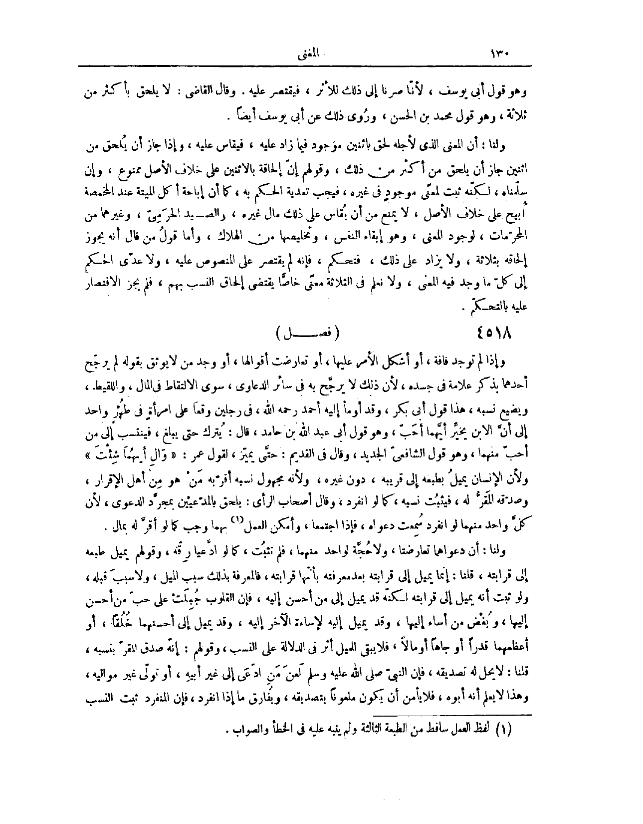 وَهُوَ قَوْلُ أَبِي يُوسُفَ؛ لِأَنَّا صِرْنَا إلَى ذَلِكَ لِلْأَثَرِ، فَيُقْتَصَرُ عَلَيْهِ. وَقَالَ الْقَاضِي: لَا يُلْحَقُ بِأَكْثَرَ مِنْ ثَلَاثَةٍ، وَهُوَ قَوْلُ مُحَمَّدِ بْنِ الْحَسَنِ. وَرُوِيَ ذَلِكَ عَنْ أَبِي يُوسُفَ أَيْضًا. وَلَنَا أَنَّ الْمَعْنَى الَّذِي لِأَجْلِهِ لَحِقَ بِاثْنَيْنِ، مَوْجُودٌ فِيمَا زَادَ عَلَيْهِ، فَيُقَاسُ عَلَيْهِ، وَإِذَا جَازَ أَنْ يُلْحَقَ مِنْ اثْنَيْنِ، جَازَ أَنْ يُلْحَقَ مِنْ أَكْثَرَ مِنْ ذَلِكَ. وَقَوْلُهُمْ: إنَّ إلْحَاقَهُ بِالِاثْنَيْنِ عَلَى خِلَافِ الْأَصْلِ مَمْنُوعٌ، وَإِنْ سَلَّمْنَاهُ، لَكِنَّهُ ثَبَتَ لِمَعْنًى مَوْجُودٍ فِي غَيْرِهِ، فَيَجِبُ تَعْدِيَةُ الْحُكْمِ بِهِ، كَمَا أَنَّ إبَاحَةَ أَكْلِ الْمَيْتَةِ عِنْدَ الْمَخْمَصَةِ أُبِيحَ عَلَى خِلَافِ الْأَصْلِ، لَا يَمْنَعُ مِنْ أَنْ يُقَاسَ عَلَى ذَلِكَ مَالُ غَيْرِهِ، وَالصَّيْدُ الْحَرَمِيُّ، وَغَيْرُهُمَا مِنْ الْمُحَرَّمَاتِ، لِوُجُودِ الْمَعْنَى، وَهُوَ إبْقَاءُ النَّفْسِ، وَتَخْلِيصُهَا مِنْ الْهَلَاكِ. وَأَمَّا قَوْلُ مَنْ قَالَ: إنَّهُ يَجُوزُ إلْحَاقُهُ بِثَلَاثَةِ، وَلَا يُزَادُ عَلَى ذَلِكَ، فَتَحَكُّمٌ، فَإِنَّهُ لَمْ يَقْتَصِرْ عَلَى الْمَنْصُوصِ عَلَيْهِ، وَلَا عَدَّى الْحُكْمَ إلَى كُلِّ مَا وُجِدَ فِيهِ الْمَعْنَى، وَلَا نَعْلَمُ فِي الثَّلَاثَةِ مَعْنًى خَاصًّا يَقْتَضِي إلْحَاقَ النَّسَبِ بِهِمْ، فَلَمْ يَجُزْ الِاقْتِصَارُ عَلَيْهِ بِالتَّحَكُّمِ.