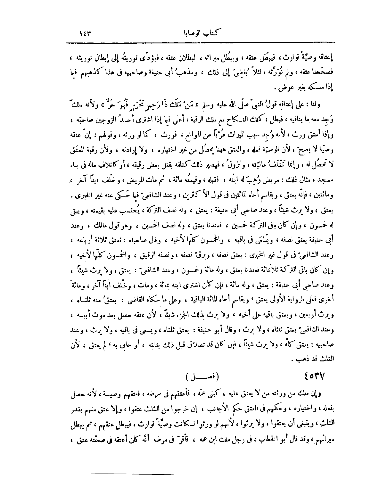 (٤٥٩٩) فَصْلٌ: وَإِنْ مَلَكَ مِنْ وَرَثَتِهِ مَنْ لَا يُعْتَقُ عَلَيْهِ، كَبَنِي عَمِّهِ، فَأَعْتَقَهُمْ فِي مَرَضِهِ، فَعِتْقُهُمْ وَصِيَّةٌ؛ لِأَنَّهُ حَصَلَ بِفِعْلِهِ وَاخْتِيَارِهِ، وَحُكْمُهُمْ فِي الْعِتْقِ حُكْمُ الْأَجَانِبِ، إنْ خَرَجُوا مِنْ الثُّلُثِ عَتَقُوا، وَإِلَّا عَتَقَ مِنْهُمْ بِقَدْرِ الثُّلُثِ. وَيَنْبَغِي أَنْ يُعْتَقُوا وَلَا يَرِثُوا؛ لِأَنَّهُمْ لَوْ وَرِثُوا لَكَانَتْ وَصِيَّةً لِوَارِثٍ، فَيَبْطُلُ عِتْقُهُمْ، ثُمَّ يَبْطُلُ مِيرَاثُهُمْ. وَقَدْ قَالَ أَبُو الْخَطَّابِ، فِي رَجُلٍ مَلَكَ ابْنَ عَمِّهِ، فَأَقَرَّ فِي مَرَضِهِ أَنَّهُ كَانَ أَعْتَقَهُ فِي صِحَّتِهِ: عَتَقَ،