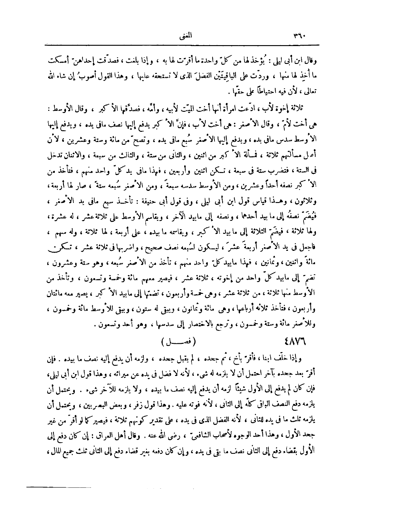 وَقَالَ ابْنُ أَبِي لَيْلَى: يُؤْخَذُ لَهَا مِنْ كُلِّ وَاحِدَةٍ مَا أَقَرَّتْ لَهَا بِهِ. وَإِذَا بَلَغَتْ فَصَدَّقَتْ إحْدَاهُنَّ، أَمْسَكَتْ مَا أُخِذَ لَهَا مِنْهَا، وَرَدَّتْ عَلَى الْبَاقِيَتَيْنِ الْفَضْلَ الَّذِي لَا تَسْتَحِقُّهُ عَلَيْهَا، وَهَذَا الْقَوْلُ أَصْوَبُ، إنْ شَاءَ اللَّهُ تَعَالَى لِأَنَّ فِيهِ احْتِيَاطًا عَلَى حَقِّهَا. ثَلَاثَةُ إخْوَةٍ لِأَبٍ، ادَّعَتْ امْرَأَةٌ أَنَّهَا أُخْتُ الْمَيِّتِ لِأَبِيهِ وَأُمِّهِ، فَصَدَّقَهَا الْأَكْبَرُ، وَقَالَ الْأَوْسَطُ: هِيَ أُخْتٌ لِأُمٍّ. وَقَالَ الْأَصْغَرُ: هِيَ أُخْتٌ لِأَبٍ.