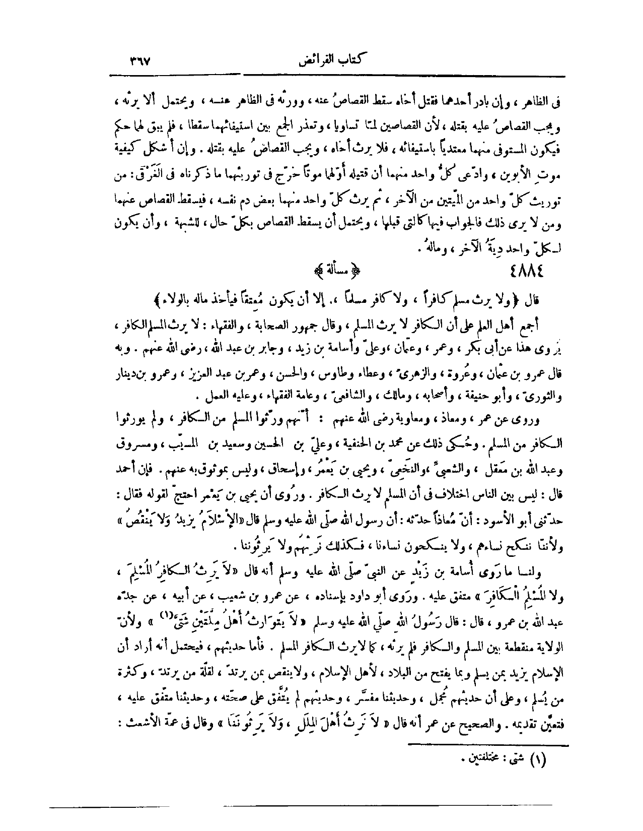 (٤٩٤٦) مَسْأَلَةٌ؛ قَالَ: (وَلَا يَرِثُ مُسْلِمٌ كَافِرًا، وَلَا كَافِرٌ مُسْلِمًا، إلَّا أَنْ يَكُونَ مُعْتَقًا، فَيَأْخُذَ مَالَهُ بِالْوَلَاءِ) أَجْمَعَ أَهْلُ الْعِلْمِ عَلَى أَنَّ الْكَافِرَ لَا يَرِثُ الْمُسْلِمَ. وَقَالَ جُمْهُورُ الصَّحَابَةِ وَالْفُقَهَاءُ: لَا يَرِثُ الْمُسْلِمُ الْكَافِرَ. يُرْوَى هَذَا عَنْ أَبِي بَكْرٍ، وَعُمَرَ، وَعُثْمَانَ، وَعَلِيٍّ، وَأُسَامَةَ بْنِ زَيْدٍ، وَجَابِرِ بْنِ عَبْدِ اللَّهِ - رَضِيَ اللَّهُ عَنْهُمْ -. وَبِهِ قَالَ عَمْرُو بْنُ عُثْمَانَ، وَعُرْوَةُ، وَالزُّهْرِيُّ، وَعَطَاءٌ، وَطَاوُسٌ، وَالْحَسَنُ، وَعُمَرُ بْنُ عَبْدِ الْعَزِيزِ، وَعَمْرُو بْنُ دِينَارٍ، وَالثَّوْرِيُّ، وَأَبُو حَنِيفَةَ، وَأَصْحَابُهُ، وَمَالِكٌ، وَالشَّافِعِيُّ، وَعَامَّةُ، الْفُقَهَاءِ. وَعَلَيْهِ الْعَمَلُ. وَرُوِيَ عَنْ عُمَرَ، وَمُعَاذٍ، وَمُعَاوِيَةَ - رَضِيَ اللَّهُ عَنْهُمْ -، أَنَّهُمْ وَرَّثُوا الْمُسْلِمَ مِنْ الْكَافِرِ، وَلَمْ يُوَرِّثُوا الْكَافِرَ مِنْ الْمُسْلِمِ. وَحُكِيَ ذَلِكَ عَنْ مُحَمَّدِ بْنِ الْحَنَفِيَّةِ، وَعَلِيِّ بْنِ الْحُسَيْنِ، وَسَعِيدِ بْنِ الْمُسَيِّبِ، وَمَسْرُوقٍ، وَعَبْدِ اللَّه بْنِ مَعْقِلٍ، وَالشَّعْبِيِّ، وَالنَّخَعِيِّ، وَيَحْيَى بْنِ يَعْمُرَ، وَإِسْحَاقَ. وَلَيْسَ بِمَوْثُوقٍ بِهِ عَنْهُمْ. فَإِنَّ أَحْمَدَ قَالَ: لَيْسَ بَيْنَ النَّاسِ اخْتِلَافٌ فِي أَنَّ الْمُسْلِمَ لَا يَرِثُ الْكَافِرَ. وَرُوِيَ أَنَّ يَحْيَى بْنَ يَعْمُرَ احْتَجَّ لِقَوْلِهِ، فَقَالَ: حَدَّثَنِي أَبُو الْأَسْوَدِ، أَنَّ مُعَاذًا حَدَّثَهُ، أَنَّ رَسُولَ اللَّهِ - صَلَّى اللَّهُ عَلَيْهِ وَسَلَّمَ - قَالَ: «الْإِسْلَامُ يَزِيدُ وَلَا يَنْقُصُ» وَلِأَنَّنَا نَنْكِحُ نِسَاءَهُمْ، وَلَا يَنْكِحُونَ نِسَاءَنَا، فَكَذَلِكَ نَرِثُهُمْ، وَلَا يَرِثُونَنَا. وَلَنَا؛ مَا رَوَى أُسَامَةُ بْنُ زَيْدٍ، عَنْ النَّبِيِّ - صَلَّى اللَّهُ عَلَيْهِ وَسَلَّمَ - أَنَّهُ قَالَ: «لَا يَرِثُ الْكَافِرُ الْمُسْلِمَ، وَلَا الْمُسْلِمُ الْكَافِرَ» . مُتَّفَقٌ عَلَيْهِ. وَرَوَى أَبُو دَاوُد بِإِسْنَادِهِ: عَنْ عَمْرِو بْنِ شُعَيْبٍ، عَنْ أَبِيهِ، عَنْ جَدِّهِ عَبْدِ اللَّهِ بْنِ عَمْرٍو، قَالَ: قَالَ رَسُولُ اللَّهِ - صَلَّى اللَّهُ عَلَيْهِ وَسَلَّمَ -: «لَا يَتَوَارَثُ أَهْلُ مِلَّتَيْنِ شَتَّى» . وَلِأَنَّ الْوِلَايَةَ مُنْقَطِعَةٌ بَيْنَ الْمُسْلِمِ وَالْكَافِرِ، فَلَمْ يَرِثْهُ، كَمَا لَا يَرِثُ الْكَافِرُ الْمُسْلِمَ. فَأَمَّا حَدِيثُهُمْ فَيُحْتَمَلُ أَنَّهُ أَرَادَ أَنَّ الْإِسْلَامَ يَزِيدُ بِمَنْ يُسْلِمُ، وَبِمَا يُفْتَحُ مِنْ الْبِلَادِ لِأَهْلِ الْإِسْلَامِ، وَلَا يَنْقُصُ بِمَنْ يَرْتَدُّ، لِقِلَّةِ مَنْ يَرْتَدُّ، وَكَثْرَةِ مِنْ يُسْلِمُ، وَعَلَى أَنَّ حَدِيثَهُمْ مُجْمَلٌ، وَحَدِيثَنَا مُفَسَّرٌ، وَحَدِيثَهُمْ لَمْ يُتَّفَقْ عَلَى صِحَّتِهِ، وَحَدِيثَنَا مُتَّفَقٌ عَلَيْهِ، فَتَعَيَّنَ تَقْدِيمُهُ. وَالصَّحِيحُ عَنْ عُمَرَ، أَنَّهُ قَالَ: لَا نَرِثُ أَهْلَ الْمِلَلِ، وَلَا يَرِثُونَنَا. وَقَالَ فِي عَمَّةِ الْأَشْعَثِ: