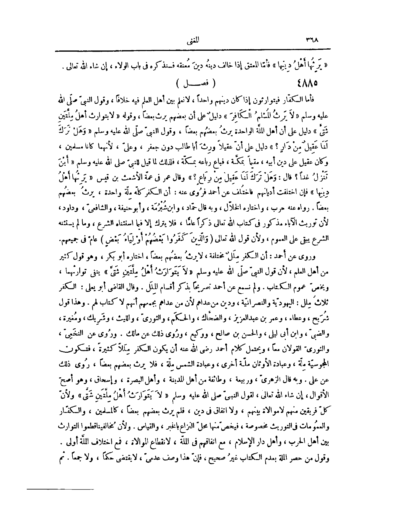 (٤٩٤٧) فَصْلٌ: فَأَمَّا الْكُفَّارُ فَيَتَوَارَثُونَ، إذَا كَانَ دِينُهُمْ وَاحِدًا، لَا نَعْلَمُ بَيْنَ أَهْلِ الْعِلْمِ فِيهِ خِلَافًا، وَقَوْلُ النَّبِيِّ - صَلَّى اللَّهُ عَلَيْهِ وَسَلَّمَ -: «لَا يَرِثُ الْمُسْلِمُ الْكَافِرَ» دَلِيلٌ عَلَى أَنَّ بَعْضَهُمْ يَرِثُ بَعْضًا. وَقَوْلُهُ: «لَا يَتَوَارَثُ أَهْلُ مِلَّتَيْنِ شَتَّى» . دَلِيلٌ عَلَى أَنَّ أَهْلَ الْمِلَّةِ الْوَاحِدَةِ يَرِثُ بَعْضُهُمْ بَعْضًا. وَقَوْلُ النَّبِيِّ - صَلَّى اللَّهُ عَلَيْهِ وَسَلَّمَ -: «وَهَلْ تَرَكَ لَنَا عَقِيلٌ مِنْ دَارٍ» . دَلِيلٌ عَلَى أَنَّ عَقِيلًا وَرِثَ أَبَا طَالِبٍ دُونَ جَعْفَرٍ، وَعَلِيٍّ لِأَنَّهُمَا كَانَا مُسْلِمَيْنِ، وَكَانَ عَقِيلٌ عَلَى دِينِ أَبِيهِ، مُقِيمًا بِمَكَّةَ، فَبَاعَ رِبَاعَهُ بِمَكَّةَ، فَلِذَلِكَ لَمَّا قِيلَ لِلنَّبِيِّ - صَلَّى اللَّهُ عَلَيْهِ وَسَلَّمَ -: أَيْنَ تَنْزِلُ غَدًا؟ قَالَ: «وَهَلْ تَرَكَ لَنَا عَقِيلٌ مِنْ رِبَاعٍ» . وَقَالَ عُمَرُ فِي عَمَّةِ الْأَشْعَثِ بْنِ قَيْس: يَرِثُهَا أَهْلُ دِينِهَا. فَإِنْ اخْتَلَفَتْ أَدْيَانُهُمْ، فَاخْتُلِفَ عَنْ أَحْمَدَ، فَرُوِيَ عَنْهُ، أَنَّ الْكُفْرَ كُلَّهُ مِلَّةٌ وَاحِدَةٌ، يَرِثُ بَعْضُهُمْ بَعْضًا. رَوَاهُ عَنْهُ حَرْبٌ، وَاخْتَارَهُ الْخَلَّالُ. وَبِهِ قَالَ حَمَّادٌ، وَابْنُ شُبْرُمَةَ، وَأَبُو حَنِيفَةَ، وَالشَّافِعِيُّ، وَدَاوُد؛ لِأَنَّ تَوْرِيثَ الْآبَاءِ مِنْ الْأَبْنَاءِ، وَالْأَبْنَاءِ مِنْ الْآبَاءِ، مَذْكُورٌ فِي كِتَابِ اللَّهِ تَعَالَى ذِكْرًا عَامًّا، فَلَا يُتْرَكُ إلَّا فِيمَا اسْتَثْنَاهُ الشَّرْعُ، وَمَا لَمْ يَسْتَثْنِهِ الشَّرْعُ يَبْقَى عَلَى الْعُمُومِ، وَلِأَنَّ قَوْلَ اللَّهِ تَعَالَى: {وَالَّذِينَ كَفَرُوا بَعْضُهُمْ أَوْلِيَاءُ بَعْضٍ} [الأنفال: ٧٣] عَامٌ فِي جَمِيعِهِمْ. وَرُوِيَ عَنْ أَحْمَدَ، أَنَّ الْكُفْرَ مِلَلٌ مُخْتَلِفَةٌ، لَا يَرِثُ بَعْضُهُمْ بَعْضًا. اخْتَارَهُ أَبُو بَكْرٍ، وَهُوَ قَوْلُ كَثِيرٍ مِنْ أَهْلِ الْعِلْمِ؛ لِأَنَّ قَوْلَ النَّبِيِّ - صَلَّى اللَّهُ عَلَيْهِ وَسَلَّمَ -: «لَا يَتَوَارَثُ أَهْلُ مِلَّتَيْنِ شَتَّى» . يَنْفِي تَوَارُثَهُمَا، وَيَخُصُّ عُمُومَ الْكِتَابِ، وَلَمْ نَسْمَعْ عَنْ أَحْمَدَ تَصْرِيحًا بِذِكْرِ أَقْسَامِ الْمِلَلِ. وَقَالَ الْقَاضِي أَبُو يَعْلَى: الْكُفْرُ ثَلَاثُ مِلَلٍ: الْيَهُودِيَّةُ، وَالنَّصْرَانِيَّةُ، وَدِينُ مَنْ عَدَاهُمْ؛ لِأَنَّ مَنْ عَدَاهُمْ يَجْمَعُهُمْ أَنَّهُمْ لَا كِتَابَ لَهُمْ. وَهَذَا قَوْلُ شُرَيْحٍ، وَعَطَاءٍ، وَعُمَرَ بْنِ عَبْدِ الْعَزِيزِ، وَالضَّحَّاكِ، وَالْحَكَمِ. وَالثَّوْرِيِّ، وَاللَّيْثِ، وَشَرِيكٍ، وَمُغِيرَةَ الضَّبِّيِّ، وَابْنِ أَبِي لَيْلَى، وَالْحَسَنِ بْنِ صَالِحٍ، وَوَكِيعٍ. وَرُوِيَ ذَلِكَ عَنْ مَالِكٍ. وَرُوِيَ عَنْ النَّخَعِيِّ، وَالثَّوْرِيِّ، الْقَوْلَانِ مَعًا. وَيَحْتَمِلُ كَلَامُ أَحْمَدَ - رَضِيَ اللَّهُ عَنْهُ - أَنْ يَكُونَ الْكُفْرُ مِلَلًا كَثِيرَةً، فَتَكُونُ الْمَجُوسِيَّةُ مِلَّةً، وَعِبَادَةُ الْأَوْثَانِ مِلَّةً أُخْرَى، وَعِبَادَةُ الشَّمْسِ مِلَّةً، فَلَا يَرِثُ بَعْضُهُمْ بَعْضًا. رُوِيَ ذَلِكَ عَنْ عَلِيٍّ. وَبِهِ قَالَ الزُّهْرِيُّ، وَرَبِيعَةُ وَطَائِفَةٌ مِنْ أَهْلِ الْمَدِينَةِ، وَأَهْلُ الْبَصْرَةِ، وَإِسْحَاقُ وَهُوَ أَصَحُّ الْأَقْوَالِ إنْ شَاءَ اللَّهُ تَعَالَى لِقَوْلِ النَّبِيِّ - صَلَّى اللَّهُ عَلَيْهِ وَسَلَّمَ -: «لَا يَتَوَارَثُ أَهْلُ مِلَّتَيْنِ شَتَّى» . وَلِأَنَّ كُلَّ فَرِيقَيْنِ مِنْهُمْ لَا مُوَالَاةَ بَيْنَهُمْ، وَلَا اتِّفَاقَ فِي دِينٍ فَلَمْ يَرِثْ بَعْضُهُمْ بَعْضًا، كَالْمُسْلِمِينَ وَالْكُفَّارِ، وَالْعُمُومَاتِ ف