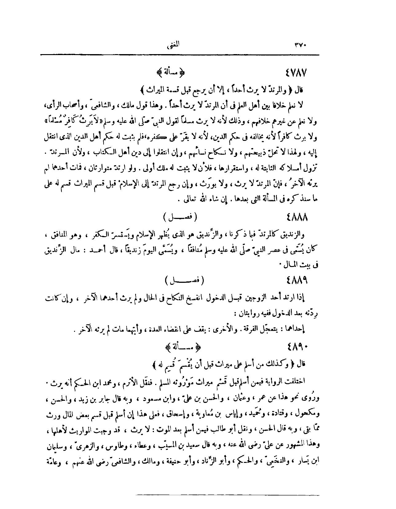 (٤٩٥٢) مَسْأَلَةٌ؛ قَالَ: (وَكَذَلِكَ مَنْ أَسْلَمَ عَلَى مِيرَاثٍ قَبْلَ أَنْ يُقْسَمَ، قُسِمَ لَهُ) اخْتَلَفَتْ الرِّوَايَةُ فِي مَنْ أَسْلَمَ قَبْلَ قَسْمِ مِيرَاثِ مَوْرُوثِهِ الْمُسْلِمِ؛ فَنَقَلَ الْأَثْرَمُ، وَمُحَمَّدُ بْنُ الْحَكَمِ، أَنَّهُ يَرِثُ. وَرُوِيَ نَحْوُ هَذَا عَنْ عُمَرَ، وَعُثْمَانَ، وَالْحَسَنِ بْنِ عَلِيٍّ، وَابْنِ مَسْعُودٍ. وَبِهِ قَالَ جَابِرُ بْنُ زَيْدٍ، وَالْحَسَنُ، وَمَكْحُولٌ، وَقَتَادَةُ، وَحُمَيْدٌ، وَإِيَاسُ بْنُ مُعَاوِيَةَ، وَإِسْحَاقُ، فَعَلَى هَذَا إنْ أَسْلَمَ قَبْلَ قَسْمِ بَعْضِ الْمَالِ وَرِثَ مِمَّا بَقِيَ. وَبِهِ قَالَ الْحَسَنُ. وَنَقَلَ أَبُو طَالِبٍ، فِي مَنْ أَسْلَمَ بَعْدَ الْمَوْتِ: لَا يَرِثُ، قَدْ وَجَبَتْ الْمَوَارِيثُ لِأَهْلِهَا. وَهَذَا الْمَشْهُورُ عَنْ عَلِيٍّ - رَضِيَ اللَّهُ عَنْهُ -. وَبِهِ قَالَ سَعِيدُ بْنُ الْمُسَيِّبِ، وَعَطَاءٌ، وَطَاوُسٌ، وَالزُّهْرِيُّ، وَسُلَيْمَانُ بْنُ يَسَارٍ، وَالنَّخَعِيُّ، وَالْحَكَمُ، وَأَبُو الزِّنَادِ، وَأَبُو حَنِيفَةَ، وَمَالِكٌ، وَالشَّافِعِيُّ - رَضِيَ اللَّهُ عَنْهُمْ -. وَعَامَّةُ