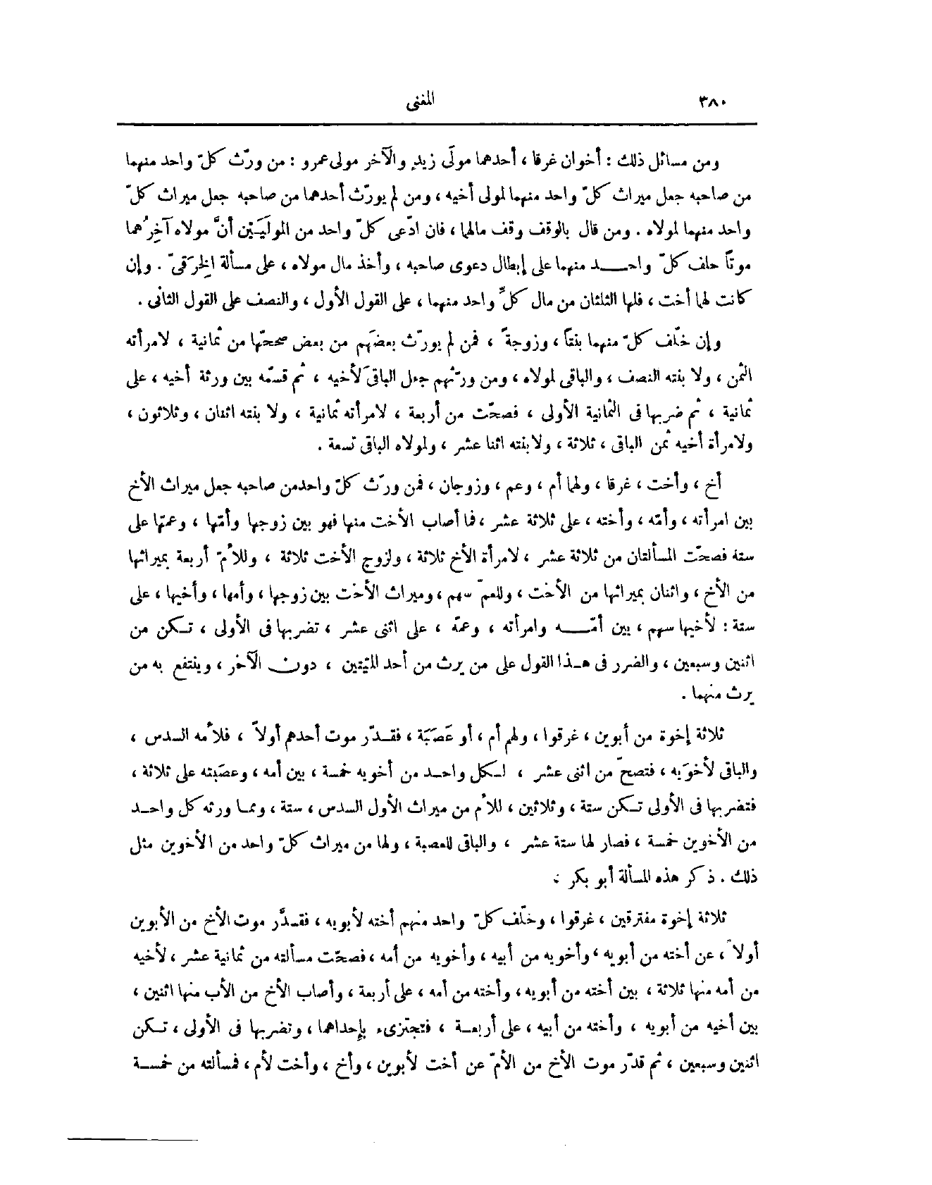 ثَلَاثَةُ إخْوَةٍ مِنْ أَبَوَيْنِ. غَرِقُوا، وَلَهُمْ أُمٌّ وَعَصَبَةٌ، فَقَدِّرْ مَوْتَ أَحَدِهِمْ أَوَّلًا، فَلِأُمِّهِ السُّدُسُ، وَالْبَاقِي لِأَخَوَيْهِ، فَتَصِحُّ مِنْ اثْنَيْ عَشَرَ، لِكُلِّ وَاحِدٍ مِنْ أَخَوَيْهِ خَمْسَةٌ، بَيْنَ أُمِّهِ وَعَصَبَتِهِ، عَلَى ثَلَاثَةٍ، فَتَضْرِبُهَا فِي الْأُولَى، تَكُنْ سِتَّةً وَثَلَاثِينَ، لِلْأُمِّ مِنْ مِيرَاثِ الْأَوَّلِ السُّدُسُ سِتَّةٌ، وَمِمَّا وَرِثَهُ كُلُّ وَاحِدٍ مِنْ الْأَخَوَيْنِ خَمْسَةٌ، فَصَارَ لَهَا سِتَّةَ عَشَرَ، وَالْبَاقِي لِلْعَصَبَةِ، وَلَهَا مِنْ مِيرَاثِ كُلِّ وَاحِدٍ مِنْ الْأَخَوَيْنِ مِثْلُ ذَلِكَ. ذَكَرَ هَذِهِ الْمَسْأَلَةَ أَبُو بَكْرٍ.