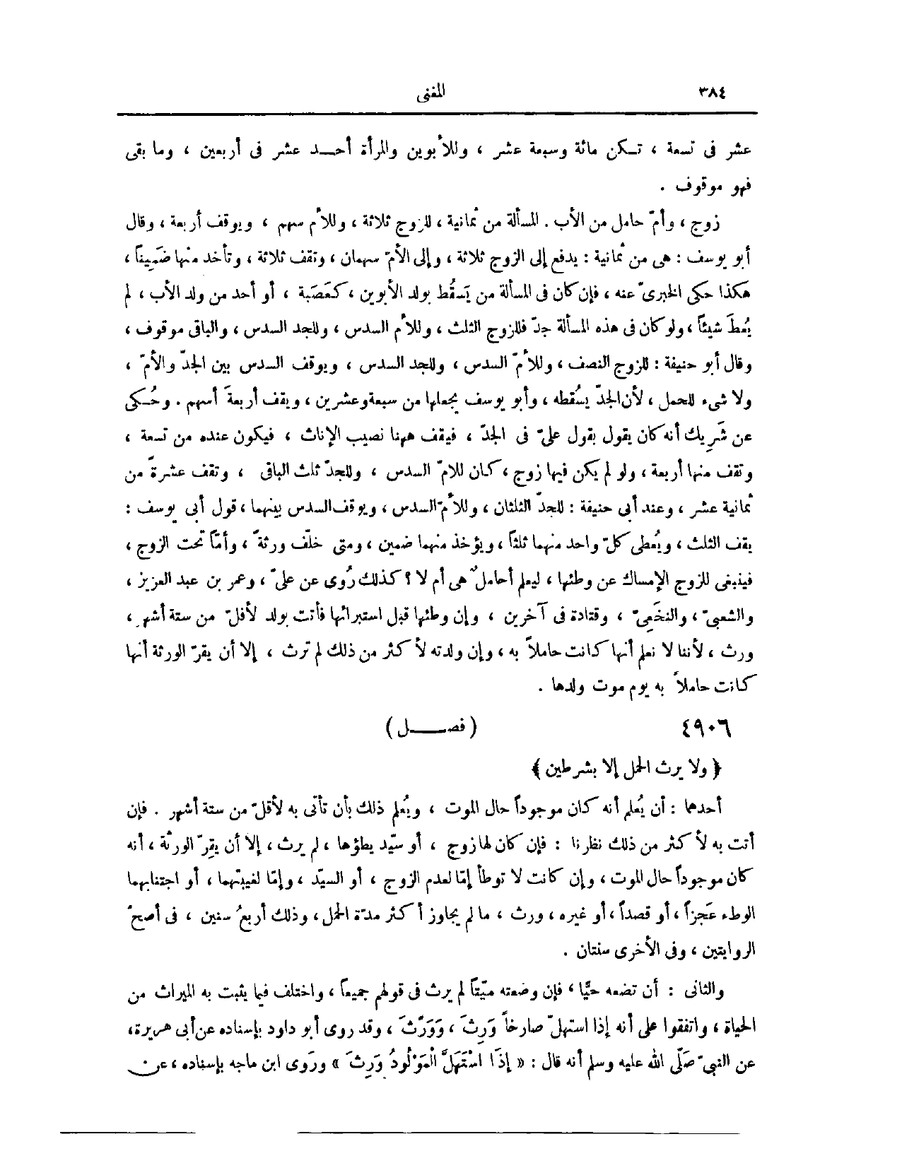 قَوْلُ أَبِي يُوسُفَ، يَقِفُ الثُّلُثَ، وَيُعْطِي كُلَّ وَاحِدٍ مِنْهُمَا ثُلُثًا، وَيُؤْخَذُ مِنْهُمَا ضَمِينٌ. وَمَتَى خَلَّفَ وَرَثَةً، وَأُمًّا تَحْتَ الزَّوْجِ، فَيَنْبَغِي لِلزَّوْجِ الْإِمْسَاكُ عَنْ وَطْئِهَا، لِيَعْلَم أَحَامِلٌ هِيَ أَمْ لَا؟ كَذَا رُوِيَ عَنْ عَلِيٍّ وَعُمَرَ بْنِ عَبْدِ الْعَزِيزِ، وَالشَّعْبِيِّ، وَالنَّخَعِيِّ، وَقَتَادَةَ، فِي آخَرِينَ. وَإِنْ وَطِئَهَا قَبْلَ اسْتِبْرَائِهَا، فَأَتَتْ بِوَلَدٍ لِأَقَلَّ مِنْ سِتَّةِ أَشْهُرٍ، وَرِثَ، لِأَنَّنَا نَعْلَمُ أَنَّهَا كَانَتْ حَامِلًا بِهِ، وَإِنْ وَلَدَتْهُ لِأَكْثَرَ مِنْ ذَلِكَ، لَمْ تَرِثْ، إلَّا أَنْ يُقِرَّ الْوَرَثَةُ أَنَّهَا كَانَتْ حَامِلًا بِهِ يَوْمَ مَوْتِ وَلَدِهَا.