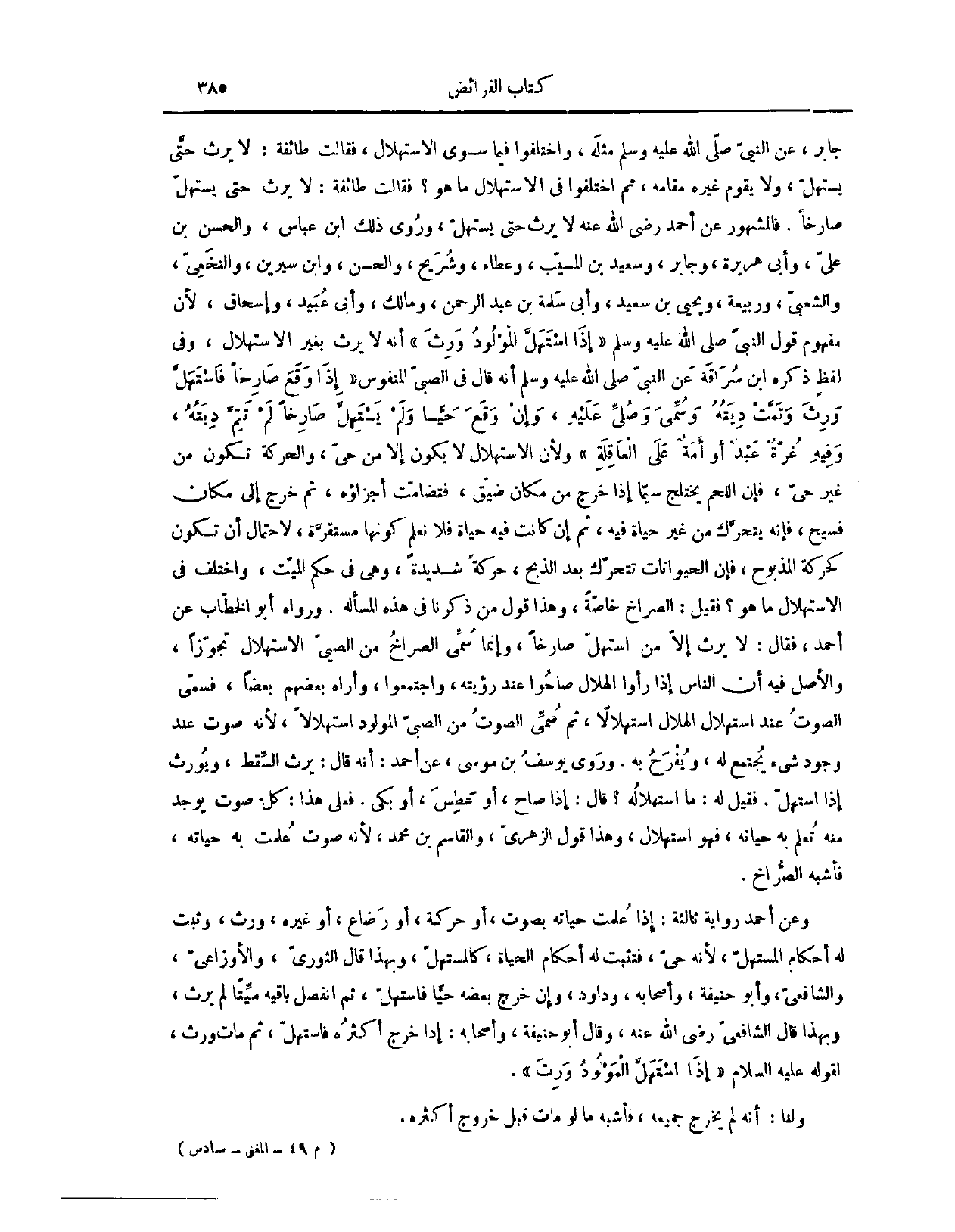 أَنَّهُ لَا يَرِثُ بِغَيْرِ الِاسْتِهْلَالِ، وَفِي لَفْظٍ ذَكَرَهُ ابْنُ سُرَاقَةَ، عَنْ النَّبِيِّ - صَلَّى اللَّهُ عَلَيْهِ وَسَلَّمَ - أَنَّهُ قَالَ فِي الصَّبِيِّ الْمَنْفُوسِ: «إذَا وَقَعَ صَارِخًا فَاسْتَهَلَّ وَرِثَ، وَتَمَّتْ دِيَتُهُ، وَسُمِّيَ، وَصُلِّيَ عَلَيْهِ، وَإِنْ وَقَعَ حَيًّا وَلَمْ يَسْتَهِلَّ صَارِخًا، لَمْ تَتِمَّ دِيَتُهُ، وَفِيهِ غُرَّةٌ؛ عَبْدٌ، أَوْ أَمَةٌ، عَلَى الْعَاقِلَةِ» . وَلِأَنَّ الِاسْتِهْلَالَ لَا يَكُونُ إلَّا مِنْ حَيٍّ، وَالْحَرَكَةُ تَكُونُ مِنْ غَيْرِ حَيٍّ، فَإِنَّ اللَّحْمَ يَخْتَلِجُ سِيَّمَا إذَا خَرَجَ مِنْ مَكَان ضَيِّقٍ، فَتَضَامَّتْ أَجْزَاؤُهُ، ثُمَّ خَرَجَ إلَى مَكَان فَسِيحٍ فَإِنَّهُ يَتَحَرَّكُ مِنْ غَيْرِ حَيَاةٍ فِيهِ، ثُمَّ إنْ كَانَتْ فِيهِ حَيَاةٌ، فَلَا نَعْلَمُ كَوْنَهَا مُسْتَقِرَّةً.