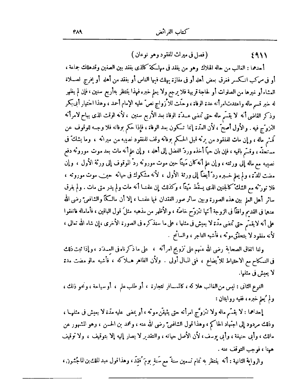 (٤٩٧٣) فَصْلٌ: فِي مِيرَاثِ الْمَفْقُودِ، وَهُوَ نَوْعَانِ؛ أَحَدُهُمَا، الْغَالِبُ مِنْ حَالِهِ الْهَلَاكُ، وَهُوَ مَنْ يُفْقَدُ فِي مَهْلَكَةٍ، كَاَلَّذِي يُفْقَدُ بَيْنَ الصَّفَّيْنِ، وَقَدْ هَلَكَ جَمَاعَةٌ، أَوْ فِي مَرْكَبٍ انْكَسَرَ، فَغَرِقَ بَعْضُ أَهْلِهِ، أَوْ فِي مَفَازَةٍ يَهْلَكُ فِيهَا النَّاسُ، أَوْ يُفْقَدُ مِنْ بَيْنِ أَهْلِهِ، أَوْ يَخْرُجُ لِصَلَاةِ الْعِشَاءِ أَوْ غَيْرِهَا مِنْ الصَّلَوَاتِ أَوْ لِحَاجَةِ قَرِيبَةٍ، فَلَا يَرْجِعُ، وَلَا يُعْلَمُ خَبَرُهُ، فَهَذَا يُنْتَظَرُ بِهِ أَرْبَعُ سِنِينَ، فَإِنْ لَمْ يَظْهَرْ لَهُ خَبَرٌ، قُسِّمَ مَالُهُ، وَاعْتَدَّتْ امْرَأَتُهُ عِدَّةَ الْوَفَاةِ، وَحَلَّتْ لِلْأَزْوَاجِ، نَصَّ عَلَيْهِ الْإِمَامُ أَحْمَدُ. وَهَذَا اخْتِيَارُ أَبِي بَكْرٍ