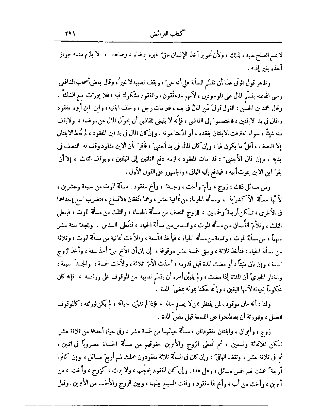 ، فَتَضْرِبُ تُسْعَ إحْدَاهُمَا فِي الْأُخْرَى، تَكُنْ أَرْبَعَةً وَخَمْسِينَ، لِلزَّوْجِ النِّصْفُ مِنْ مَسْأَلَةِ الْحَيَاةِ، وَالثُّلُثُ مِنْ مَسْأَلَةِ الْمَوْتِ، فَيُعْطَى الثُّلُثَ، وَلِلْأُمِّ التُّسْعَانِ مِنْ مَسْأَلَةِ الْمَوْتِ، وَالسُّدُسُ مِنْ مَسْأَلَةِ الْحَيَاةِ، فَتُعْطَى السُّدُسَ، وَلِلْجَدِّ سِتَّةَ عَشَرَ سَهْمًا مِنْ مَسْأَلَةِ الْمَوْتِ، وَتِسْعَةٌ مِنْ مَسْأَلَةِ الْحَيَاةِ، فَيَأْخُذُ التِّسْعَةَ، وَلِلْأُخْتِ ثَمَانِيَةٌ مِنْ مَسْأَلَةِ الْمَوْتِ، وَثَلَاثَةٌ مِنْ مَسْأَلَةِ الْحَيَاةِ، فَتَأْخُذُ ثَلَاثَةً، وَيَبْقَى خَمْسَةَ عَشَرَ مَوْقُوفَةً، إنْ بَانَ أَنَّ الْأَخَ حَيٌّ، وَأَخَذَ سِتَّةً، وَأَخَذَ الزَّوْجُ تِسْعَةً، وَإِنْ بَانَ مَيِّتًا، أَوْ مَضَتْ الْمُدَّةُ قَبْلَ قُدُومِهِ، أَخَذَتْ الْأُمُّ ثَلَاثَةً، وَالْأُخْتُ خَمْسَةً، وَالْجَدُّ سَبْعَةً