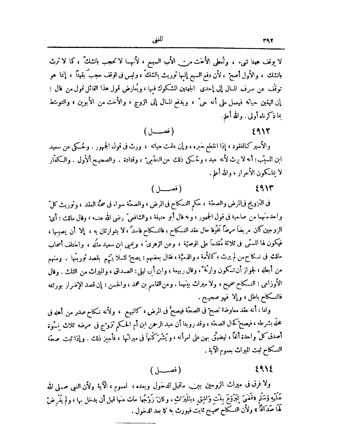 (٤٩٧٥) فَصْلٌ: فِي التَّزْوِيجِ فِي الْمَرَضِ وَالصِّحَّةِ. حُكْمُ النِّكَاحِ فِي الْمَرَضِ وَالصِّحَّةِ سَوَاءٌ فِي صِحَّةِ الْعَقْدِ، وَتَوْرِيثِ كُلِّ وَاحِدٍ مِنْهُمَا مِنْ صَاحِبِهِ، فِي قَوْلِ الْجُمْهُورِ. وَبِهِ قَالَ أَبُو حَنِيفَةَ، وَالشَّافِعِيُّ - رَضِيَ اللَّهُ عَنْهُمَا -. وَقَالَ مَالِكٌ: أَيُّ الزَّوْجَيْنِ كَانَ مَرِيضًا مَرَضًا مَخُوفًا حَالَ عَقْدِ النِّكَاحِ، فَالنِّكَاحُ فَاسِدٌ لَا يَتَوَارَثَانِ بِهِ إلَّا أَنْ يُصِيبَهَا، فَيَكُونَ لَهَا الْمُسَمَّى فِي ثَلَاثَةٍ مُقَدَّمًا عَلَى الْوَصِيَّةِ