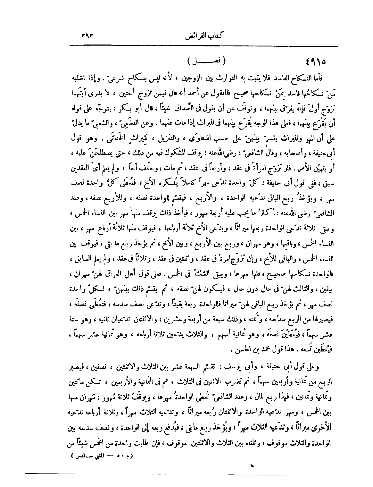 فَعَلَى هَذَا الْوَجْهِ يُقْرَعُ بَيْنَهُمَا فِي الْمِيرَاثِ إذَا مَاتَ عَنْهُمَا. وَعَنْ النَّخَعِيِّ، وَالشَّعْبِيِّ، مَا يَدُلُّ عَلَى أَنَّ الْمَهْرَ وَالْمِيرَاثَ يُقَسَّمُ بَيْنَهُنَّ عَلَى حَسَبِ الدَّعَاوَى وَالتَّنْزِيلِ، كَمِيرَاثِ الْخَنَاثَى. وَهُوَ قَوْلُ أَبِي حَنِيفَةَ وَأَصْحَابِهِ. وَقَالَ الشَّافِعِيُّ - رَضِيَ اللَّهُ عَنْهُ -: يُوقَفُ الْمَشْكُوكُ فِيهِ مِنْ ذَلِكَ حَتَّى يَصْطَلِحْنَ عَلَيْهِ، أَوْ يَتَبَيَّنَ الْأَمْرُ. فَلَوْ تَزَوَّجَ امْرَأَةً فِي عَقْدٍ، وَأَرْبَعًا فِي عَقْدٍ، ثُمَّ مَاتَ، وَخَلَّفَ أَخًا، وَلَمْ يُعْلَمْ أَيُّ الْعَقْدَيْنِ سَبَقَ، فَفِي قَوْلِ أَبِي حَنِيفَةَ، كُلُّ وَاحِدَةٍ تَدَّعِي مَهْرًا كَامِلًا يُنْكِرُهُ الْأَخُ، فَتُعْطَى كُلُّ وَاحِدَةٍ نِصْفَ مَهْرٍ، وَيُؤْخَذُ رُبُعُ الْبَاقِي تَدَّعِيهِ الْوَاحِدَةُ وَالْأَرْبَعُ، فَيُقَسَّمُ لِلْوَاحِدَةِ نِصْفُهُ، وَلِلْأَرْبَعِ نِصْفُهُ