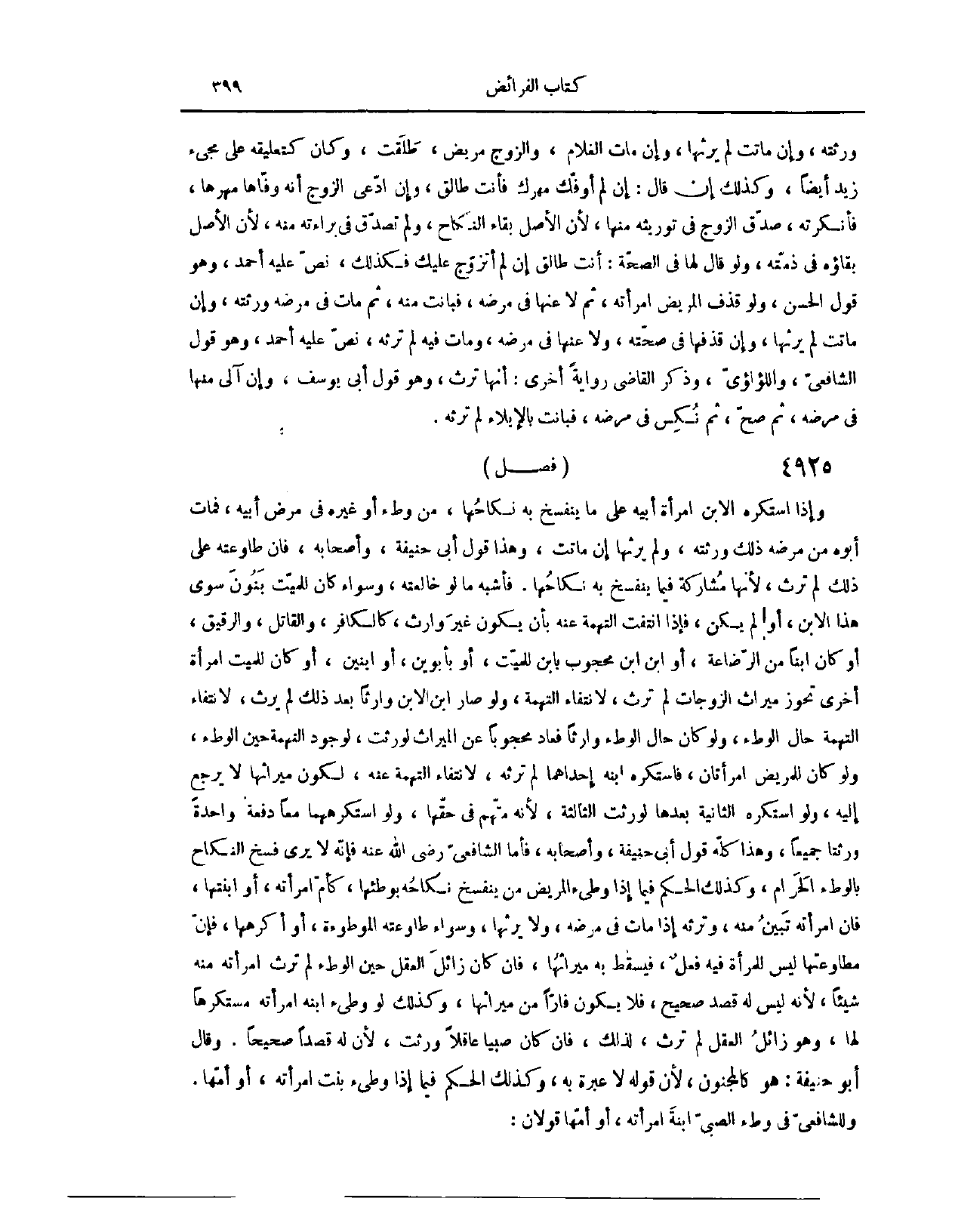 (٤٩٨٧) فَصْلٌ: وَإِذَا اسْتَكْرَهَ الِابْنُ امْرَأَةَ أَبِيهِ عَلَى مَا يَنْفَسِخُ بِهِ نِكَاحُهَا، مِنْ وَطْءٍ أَوْ غَيْرِهِ، فِي مَرَضِ أَبِيهِ، فَمَاتَ أَبُوهُ مِنْ مَرَضِهِ ذَلِكَ، وَرِثَتْهُ، وَلَمْ يَرِثْهَا إنْ مَاتَتْ. وَهَذَا قَوْلُ أَبِي حَنِيفَةَ وَأَصْحَابِهِ. فَإِنْ طَاوَعَتْهُ عَلَى ذَلِكَ، لَمْ تَرِثْ؛ لِأَنَّهَا مُشَارِكَةٌ فِيمَا يَنْفَسِخُ بِهِ نِكَاحُهَا، فَأَشْبَهَ مَا لَوْ خَالَعَتْهُ. وَسَوَاءٌ كَانَ لِلْمَيِّتِ بَنُونَ سِوَى هَذَا الِابْنِ، أَوْ لَمْ يَكُنْ. فَإِذَا انْتَفَتْ التُّهْمَةُ عَنْهُ، بِأَنْ يَكُونَ غَيْرَ وَارِثٍ، كَالْكَافِرِ وَالْقَاتِلِ وَالرَّقِيقِ، أَوْ كَانَ ابْنًا مِنْ الرَّضَاعَةِ، أَوْ ابْنَ ابْنٍ مَحْجُوبٍ بِابْنٍ لِلْمَيْتِ، أَوْ بِأَبَوَيْنِ، أَوْ ابْنَيْنِ، أَوْ كَانَ لِلْمَيْتِ امْرَأَةٌ أُخْرَى تَجُوزُ مِيرَاثَ الزَّوْجَاتِ، لَمْ تَرِثْ؛ لِانْتِفَاءِ التُّهْمَةِ