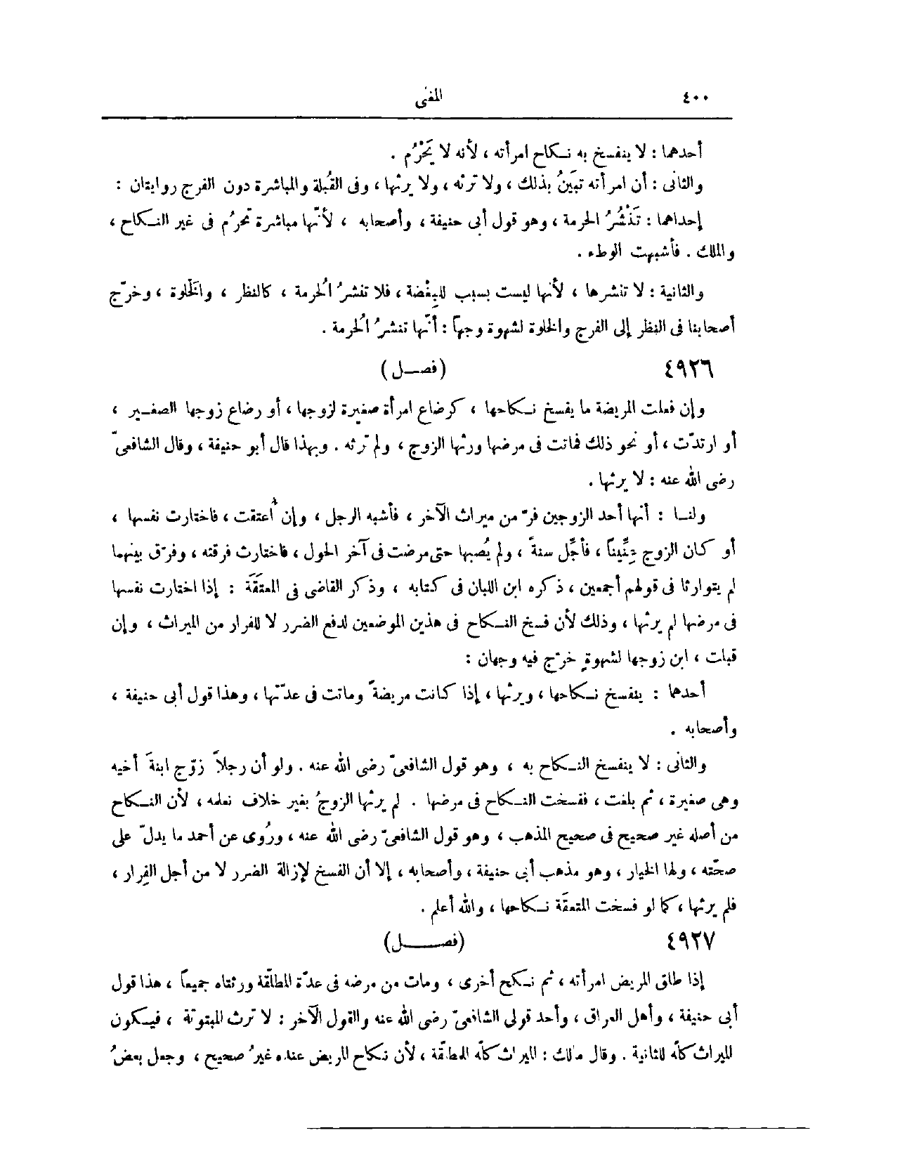 وَهَذَا قَوْلُ أَبِي حَنِيفَةَ وَأَصْحَابِهِ. وَالثَّانِي، لَا يَنْفَسِخُ النِّكَاحُ بِهِ. وَهُوَ قَوْلُ الشَّافِعِيِّ - رَضِيَ اللَّهُ عَنْهُ -. وَلَوْ أَنَّ رَجُلًا زَوَّجَ ابْنَةَ أَخِيهِ وَهِيَ صَغِيرَةٌ، ثُمَّ بَلَغَتْ، فَفَسَخَتْ النِّكَاحَ فِي مَرَضِهَا، لَمْ يَرِثْهَا الزَّوْجُ. بِغَيْرِ خِلَافٍ نَعْلَمُهُ؛ لِأَنَّ النِّكَاحَ مِنْ أَصْلِهِ غَيْرُ صَحِيحٍ فِي صَحِيحِ الْمَذْهَبِ، وَهُوَ قَوْلُ الشَّافِعِيِّ - رَضِيَ اللَّهُ عَنْهُ -. وَرُوِيَ عَنْ أَحْمَدَ مَا يَدُلُّ عَلَى صِحَّتِهِ، وَلَهَا الْخِيَارُ. وَهُوَ مَذْهَبُ أَبِي حَنِيفَةَ وَأَصْحَابِهِ، إلَّا أَنَّ الْفَسْخَ لِإِزَالَةِ الضَّرَرِ لَا مِنْ أَجْلِ الْفِرَارِ، فَلَمْ يَرِثْهَا، كَمَا لَوْ فَسَخَتْ الْمُعْتَقَةُ نِكَاحَهَا. وَاَللَّهُ أَعْلَمُ.