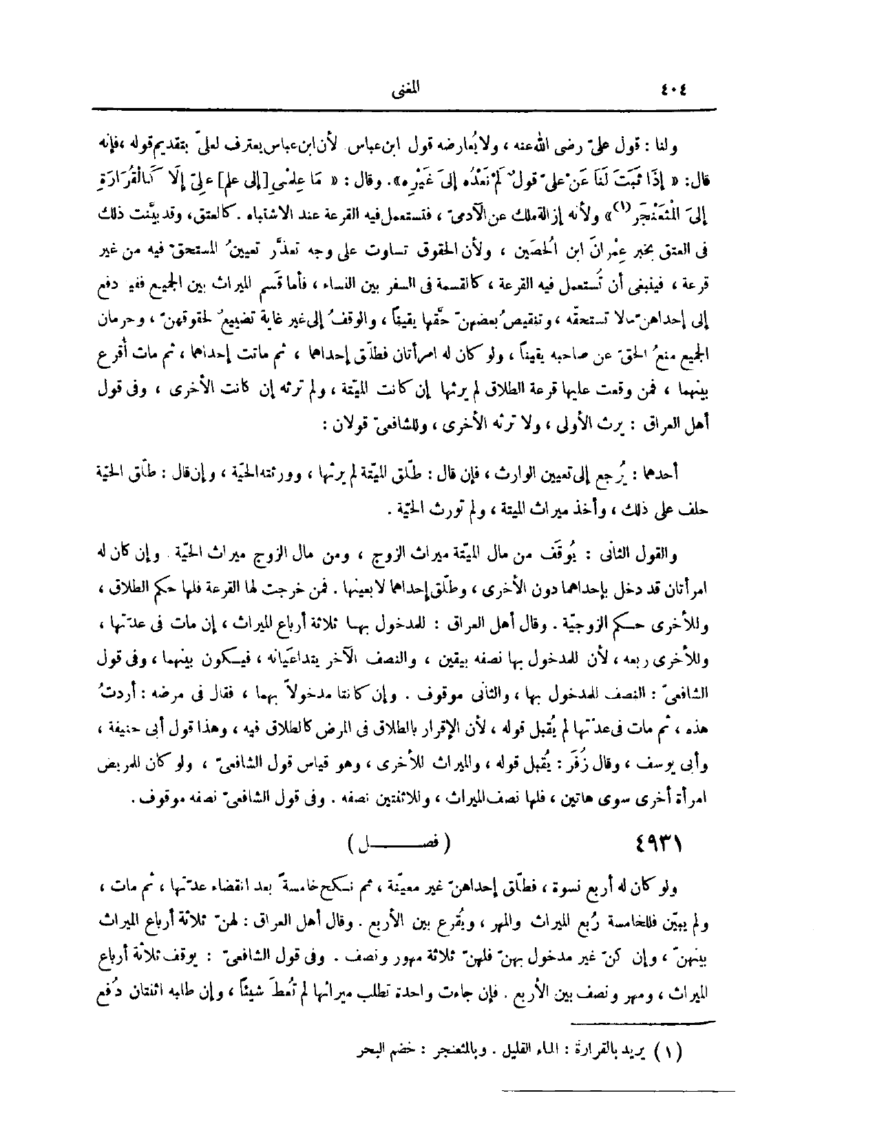 (٤٩٩١) فَصْلٌ: وَلَوْ كَانَ أَرْبَعُ نِسْوَةٍ، فَطَلَّقَ إحْدَاهُنَّ غَيْرَ مُعَيَّنَةٍ، ثُمَّ نَكَحَ خَامِسَةً بَعْدَ انْقِضَاءِ عِدَّتِهَا، ثُمَّ مَاتَ وَلَمْ يُبَيِّنْ، فَلِلْخَامِسَةِ رُبُعُ الْمِيرَاثِ وَالْمَهْرُ، وَيُقْرَعُ بَيْنَ الْأَرْبَعِ. وَقَالَ أَهْلُ الْعِرَاقِ: لَهُنَّ ثَلَاثَةُ أَرْبَاعِ الْمِيرَاثِ بَيْنَهُنَّ وَإِنْ كُنَّ غَيْرَ مَدْخُولٍ بِهِنَّ، فَلَهُنَّ ثَلَاثَةُ مُهُورٍ وَنِصْفٌ. وَفِي قَوْلِ الشَّافِعِيِّ، يُوقَفُ ثَلَاثَةُ أَرْبَاعِ الْمِيرَاثِ، وَمَهْرٌ وَنِصْفٌ بَيْنَ الْأَرْبَعِ، فَإِنْ جَاءَتْ وَاحِدَةٌ تَطْلُبُ مِيرَاثَهَا لَمْ تُعْطَ شَيْئًا