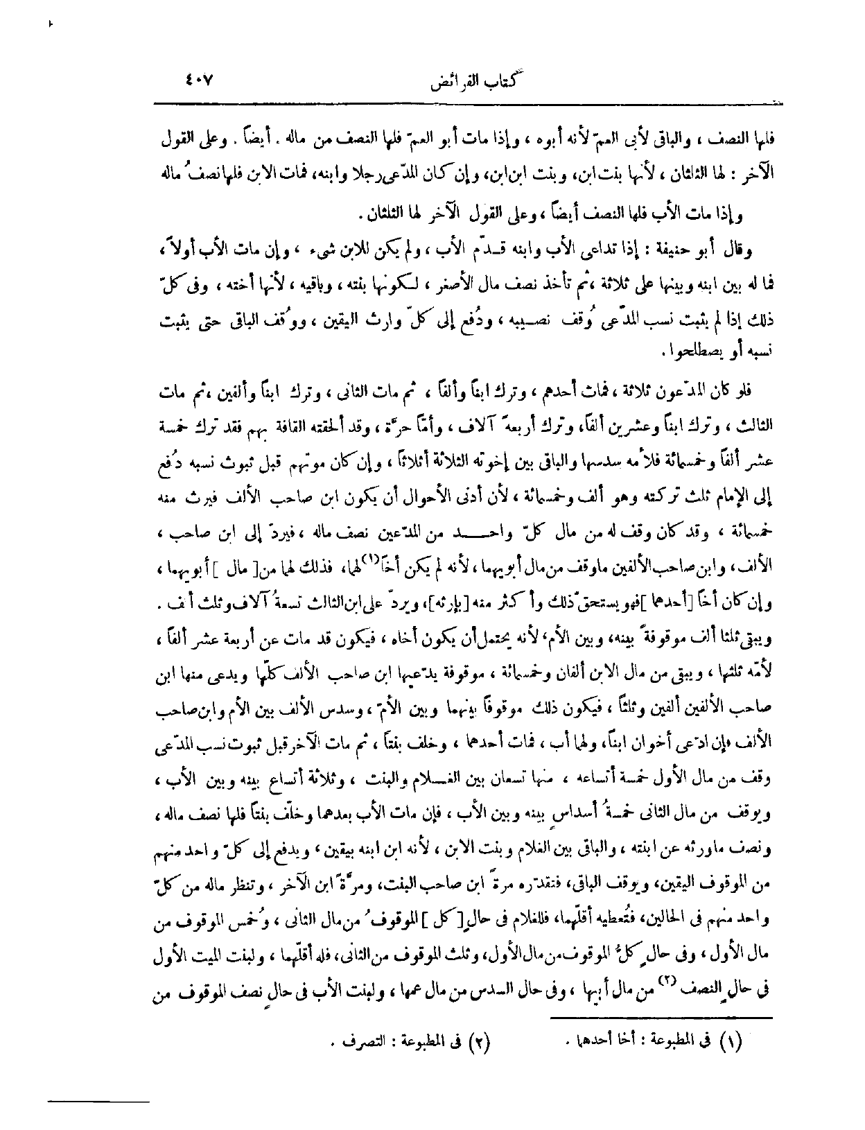 وَتَنْظُرُ مَالَهُ مِنْ كُلِّ وَاحِدٍ مِنْهُمْ فِي الْحَالَيْنِ، فَتُعْطِيهِ أَقَلَّهُمَا، فَلِلْغُلَامِ فِي حَالٍ الْمَوْقُوفِ مِنْ مَالِ الثَّانِي، وَخُمْسُ الْمَوْقُوفِ مِنْ مَالِ الْأَوَّلِ، وَفِي حَالٍ كُلُّ الْمَوْقُوفِ مِنْ مَالِ الْأَوَّلِ، وَثُلُثُ الْمَوْقُوفِ مِنْ الثَّانِي، فَلَهُ أَقَلُّهُمَا، وَلِبِنْتِ الْمَيِّتِ الْأَوَّلِ فِي حَالٍ النِّصْفُ مِنْ مَالِ أَبِيهَا، وَفِي حَالٍ السُّدُسُ مِنْ مَالِ عَمِّهَا، وَلِبِنْتِ الْأَبِ فِي حَالٍ نِصْفُ الْمَوْقُوفِ مِنْ